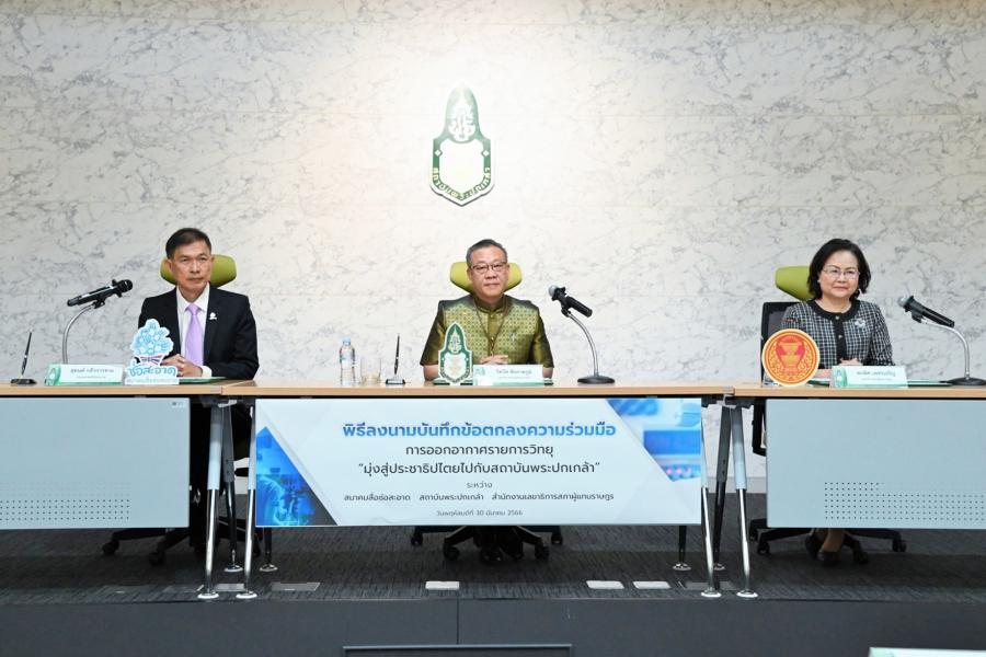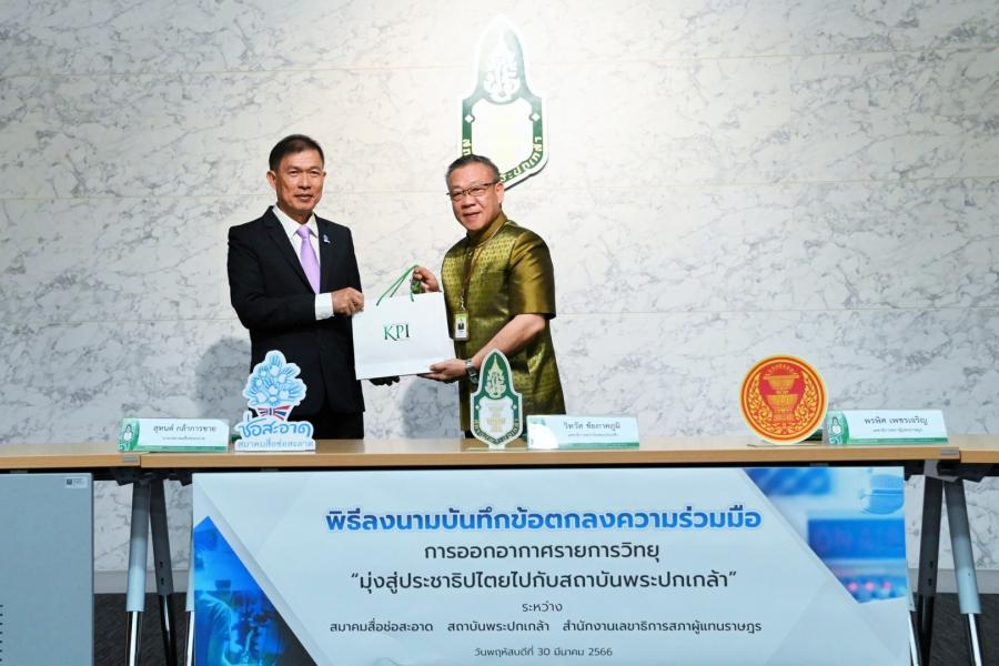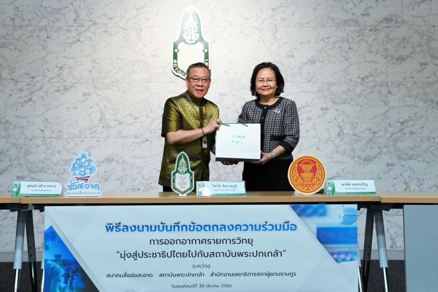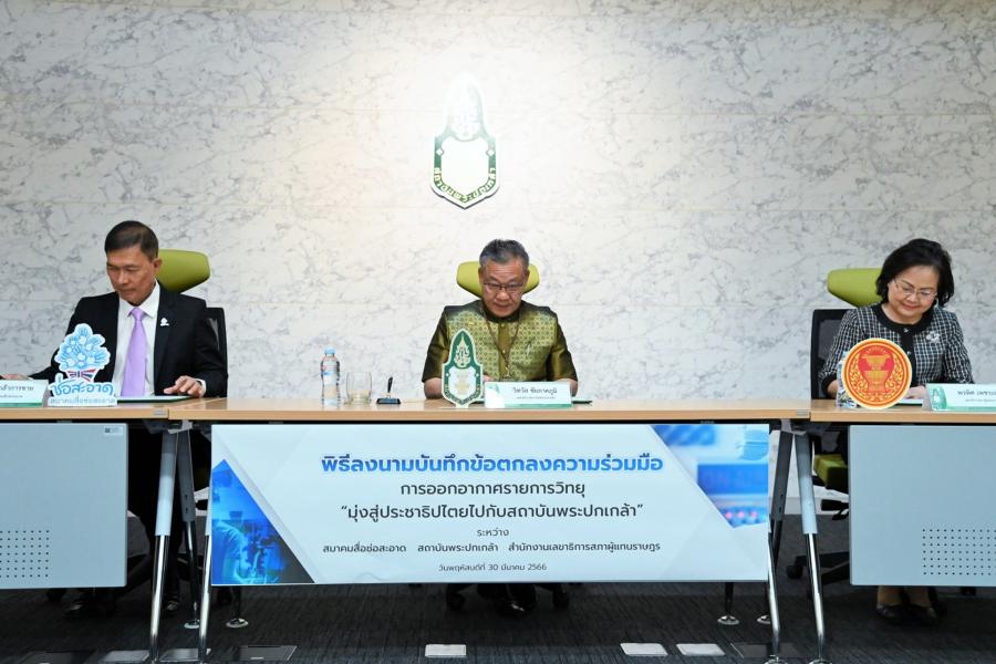 พิธีลงนามบันทึกข้อตกลงความร่วมมือ (MOU)การออกอากาศรายการ วิทยุมุ่งสู่ประชาธิปไตยไปกับสถาบันพระปกเกล้า ระหว่างสถาบันพระปกเกล้าสำนักงานเลขาธิการสภาผู้แทนราษฎร และสมาคมสื่อช่อสะอาด