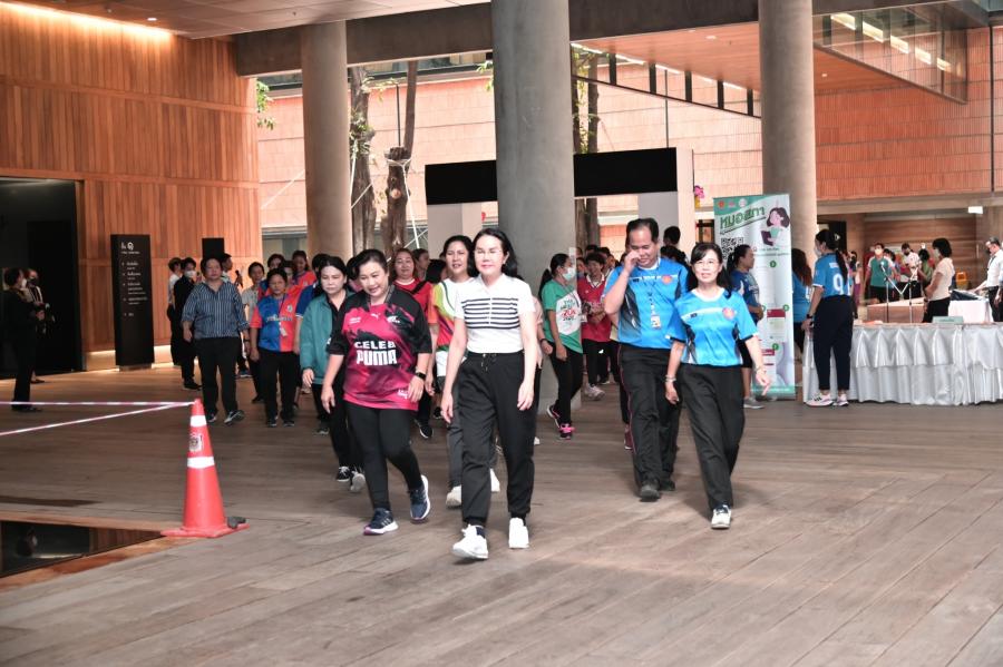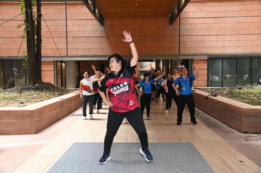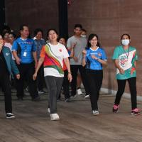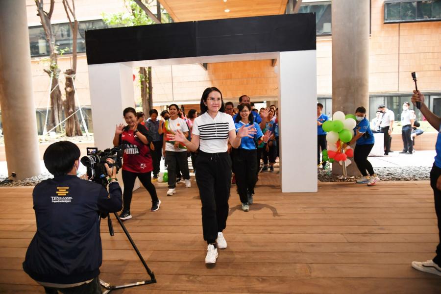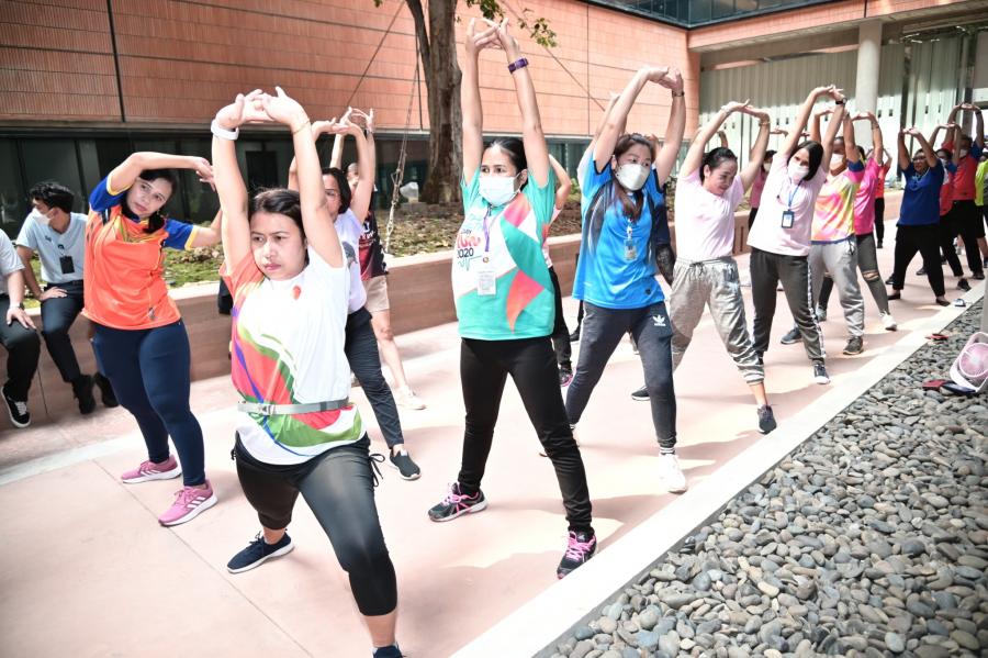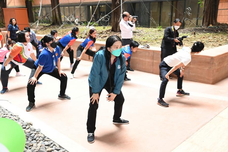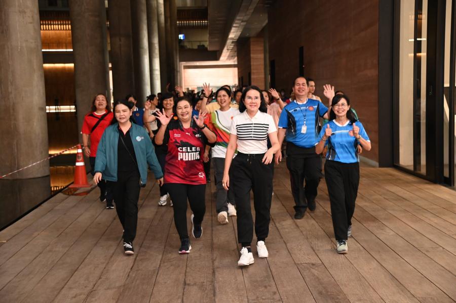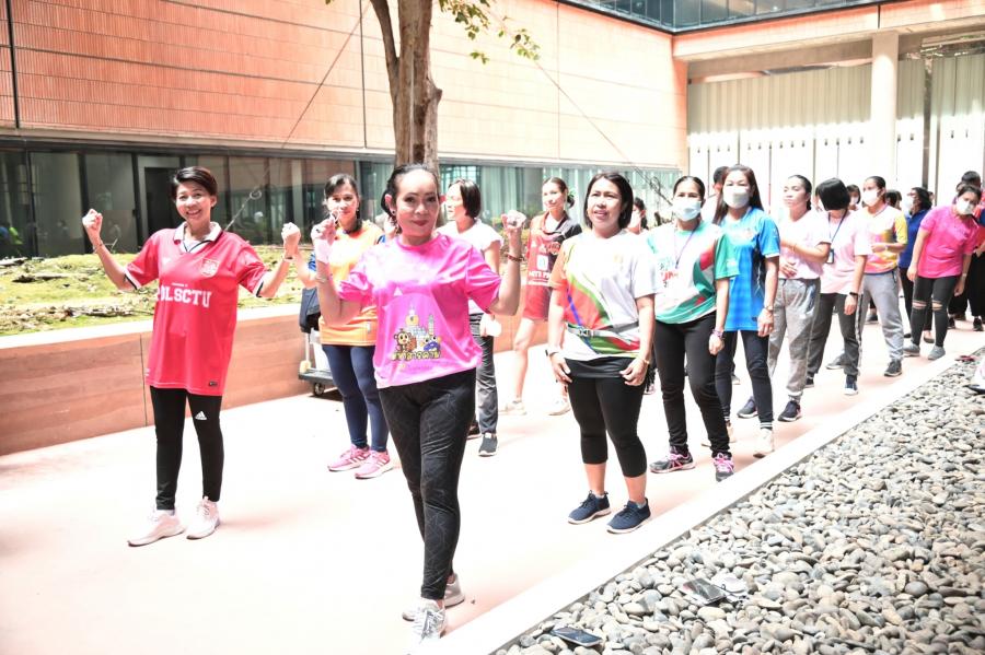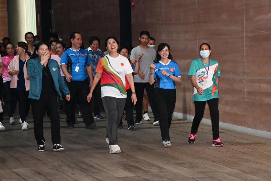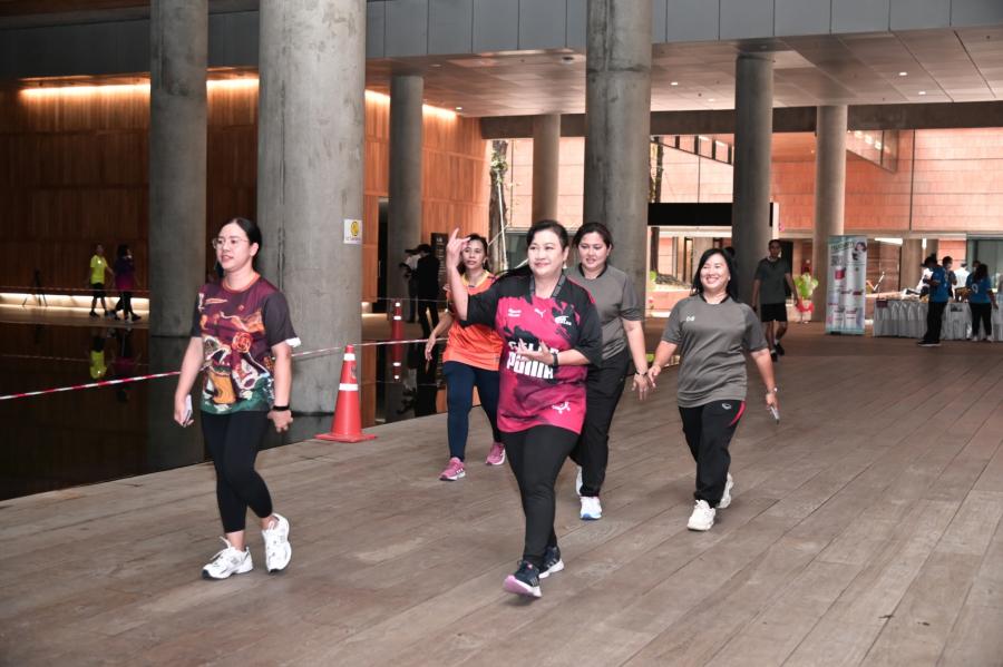 จากนั้น เป็นกิจกรรมการวอร์มอัพร่างกาย ก่อนการเดิน วิ่งรอบสระมรกต นำโดย นางฑิฆัมพร กาญจโนภาศ ผู้อำนวยการสำนักประชาสัมพันธ์ ต่อจากนั้น น.ส.กัลยรัชต์ ขาวสำอางค์ นำเดิน - วิ่ง รอบสระมรกต 3 รอบ เพื่อเป็นการรณรงค์ เดิน - วิ่ง อันจะเป็นการส่งเสริมให้บุคลากรมีสุขภาพที่ดีและแข็งแรง