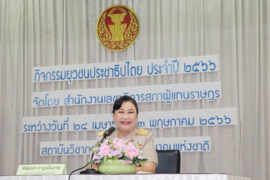 วันจันทร์ที่ 24 เมษายน 2566 เวลา 13.00 นาฬิกา ณ สถาบันวิชาการ NT จังหวัดนนทบุรี นางฑิฆัมพร กาญจโนภาศ ผู้อำนวยการสำนักประชาสัมพันธ์ กล่าวปฐมนิเทศให้กับยุวชนประชาธิปไตย ประจำปี 2566 โดยได้กล่าวถึงบทบาทหน้าที่ของสำนักงาน​เลขาธิการ​สภาผู้แทน​ราษฎร​  ความเป็นมาและการดำเนินงานของกิจกรรมยุวชนประชาธิปไตย ประจำปี 2566 กำหนดการการจัดกิจกรรม​ รวมถึงข้อควรปฏิบัติของยุวชนประชาธิปไตย