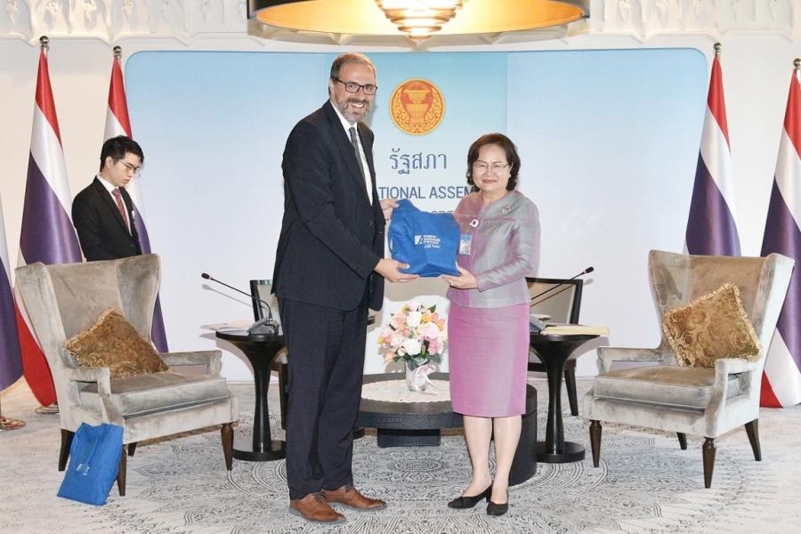 นายคริสเตียน เอ็ชเล่อ หัวหน้าทีมเอเชียและแปซิฟิก ฝ่ายความร่วมมือภาคพื้นยุโรปและนานาชาติ มูลนิธิคอนราด อาเดนาวร์ กล่าวขอบคุณที่สละเวลาให้เข้าพบปะหารือ และกล่าวถึงวัตถุประสงค์ของการดำเนินงานของมูลนิธิที่มุ่งหวังให้สมาชิกรัฐสภากับประชาชนมีปฏิสัมพันธ์อย่างใกล้ชิดและทำงานร่วมกันเพื่อประชาธิปไตยและสังคม ทั้งนี้ ภายหลังการแพร่ระบาดของโรคโควิด-19 มูลนิธิฯ จะเร่งสร้างความร่วมมือกับภาคส่วนต่าง ๆ เพื่อส่งเสริมความเข้มแข็งระหว่างภูมิภาค และชื่นชมที่ไทยจัดการเลือกตั้งผ่านไปด้วยดี นอกจากนี้ หัวหน้าทีมเอเชียและแปซิฟิกฯ ยังได้ส่งมอบสัญญาความร่วมมือระหว่างสำนักงานฯ กับมูลนิธิฯ เพื่อสนับสนุนการดำเนินกิจกรรม จำนวน 2 โครงการในปี 2566