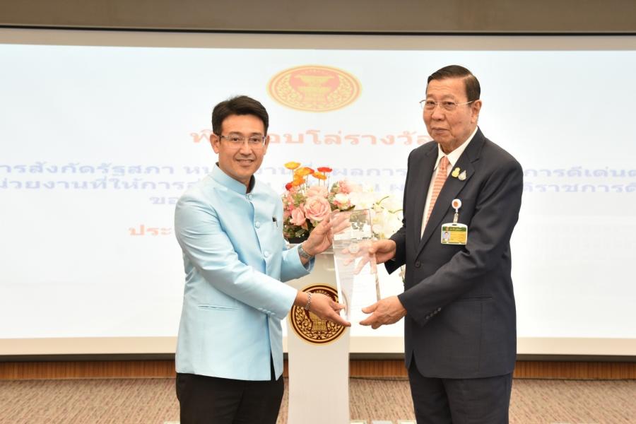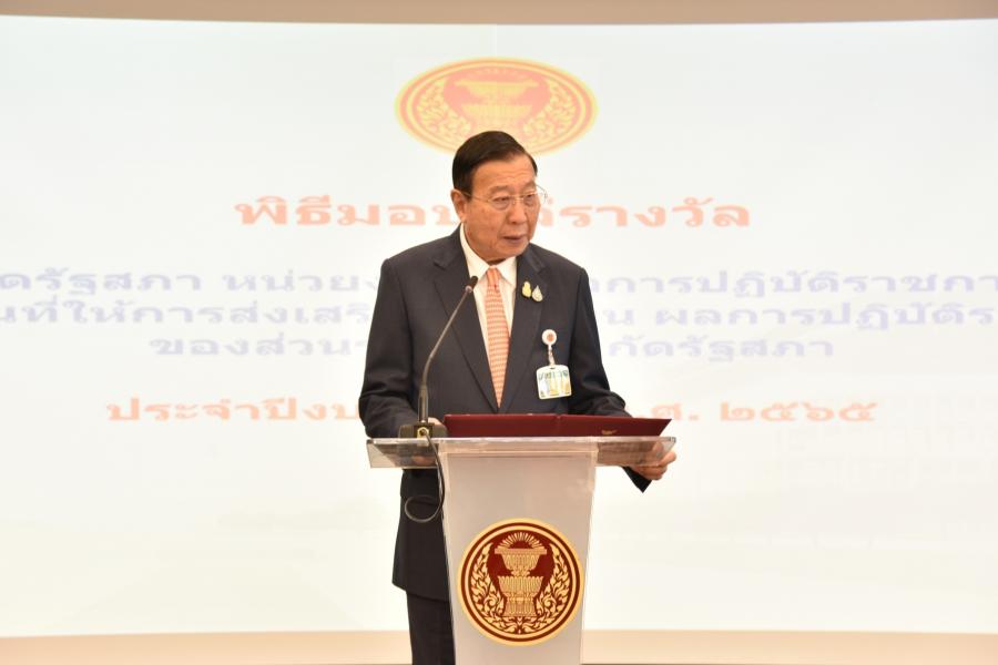 | วันพฤหัสบดีที่ 22 มิถุนายน 2566 เวลา 10.00 นาฬิกา ณ ห้องประชุม 602 ชั้น 6 อาคารรัฐสภา ศาสตราจารย์พิเศษพรเพชร วิชิตชลชัย ประธานวุฒิสภา ทำหน้าที่ประธานรัฐสภา ในฐานะประธาน ก.ร. เป็นประธานในพิธีมอบโล่รางวัลให้ส่วนราชการสังกัดรัฐสภา หน่วยงานที่มีผลการปฏิบัติราชการดีเด่นตามตัวชี้วัดและหน่วยงานส่งเสริม สนับสนุนผลการปฏิบัติราชการดีเด่นของส่วนราชการสังกัดรัฐสภา ประจำปีงบประมาณ พ.ศ. 2565 โดยมี น.ส.ศุภพรรัตน์ สุขพุ่ม รองเลขาธิการสภาผู้แทนราษฎร ในฐานะประธานกรรมการพิจารณากำหนดกรอบตัวชี้วัด น้ำหนัก เป้าหมาย เกณฑ์การให้คะแนนตัวชี้วัดของส่วนราชการสังกัดรัฐสภา ประจำปีงบประมาณ พ.ศ. 2565 กล่าวรายงาน ในการนี้ พล.ร.อ.สุรศักดิ์ ศรีอรุณ กรรมการข้าราชการรัฐสภา นางพรพิศ เพชรเจริญ เลขาธิการสภาผู้แทนราษฎร น.ส.นภาภรณ์ ใจสัจจะ เลขาธิการวุฒิสภา พร้อมด้วยคณะผู้บริหารของสำนักงานเลขาธิการสภาผู้แทนราษฎรและสำนักงานเลขาธิการวุฒิสภา เข้าร่วมในพิธี