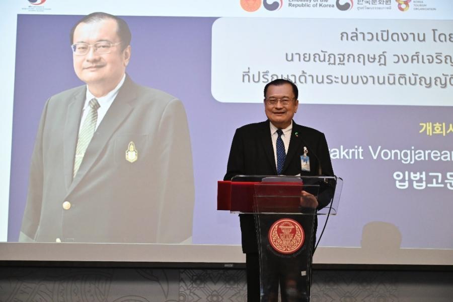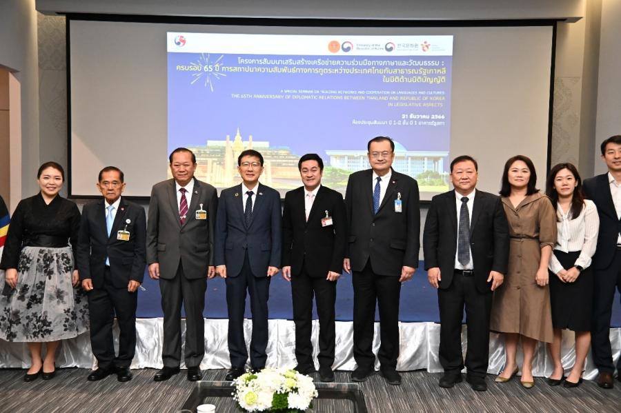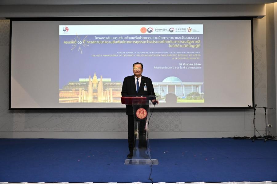 วันพฤหัสบดีที่ 21 ธันวาคม 2566 เวลา 08.30 นาฬิกา ณ ห้องประชุมสัมมนา B1-2 ชั้น B1 อาคารรัฐสภา นายปดิพัทธ์ สันติภาดา รองประธานสภาผู้แทนราษฎร คนที่หนึ่ง เข้าร่วมพิธีเปิดโครงการสัมมนาเสริมสร้างเครือข่ายความร่วมมือทางภาษาและวัฒนธรรมครบรอบ 65 ปี การสถาปนาความสัมพันธ์ทางการทูตระหว่างประเทศไทยกับสาธารณรัฐเกาหลีในมิติด้านนิติบัญญัติ โดยมี นายณัฏฐกฤษฎ์ วงศ์เจริญ ที่ปรึกษาด้านระบบงานนิติบัญญัติ เป็นประธานในพิธีเปิด น.ส.กฤษณี มาศรีจันทร์ ผู้อำนวยการสำนักภาษาต่างประเทศ กล่าวรายงาน นายฮัม จอง-ฮัน (Mr. Ham Jeong-han) อัครราชทูตสาธารณรัฐเกาหลีประจำประเทศไทย และพล.ร.อ.อิทธิคมน์ ภมรสูต ประธานกลุ่มมิตรภาพสมาชิกรัฐสภาไทย-เกาหลีใต้ กล่าวแสดงความยินดี เนื่องในโอกาสครบรอบ 65 ปี การสถาปนาความสัมพันธ์ทางการทูตระหว่างประเทศไทยกับสาธารณรัฐเกาหลี ในการนี้ สมาชิกรัฐสภา ผู้บริหาร พร้อมด้วยข้าราชการสำนักงานเลขาธิการสภาผู้แทนราษฎร และข้าราชการสำนักงานเลขาธิการวุฒิสภา เข้าร่วมงานอย่างคับคั่ง