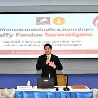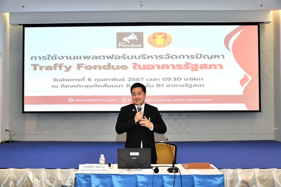 จากนั้น เวลา 09.40 น เป็นการชี้แจงและแนะนำการใช้งานเพลตฟอร์มบริหารจัดการปัญหา Traffy Fondue ในอาคารรัฐสภา ได้รับเกียรติจาก นายวสันต์ ภัทรอธิคม ผู้พัฒนา Traffy Fondue ในฐานะผู้อำนวยการหน่วยบริการนวัตกรรมดิจิทัลสำหรับเมือง สำนักงานพัฒนาวิทยาศาสตร์และเทคโนโลยีแห่งชาติ (สวทช.) สำหรับการฝึกอบรมดังกล่าว จัดโดยคณะกรรมการขับเคลื่อนรัฐสภาโปร่งใสและสมรรถนะสูง มีวัตถุประสงค์เพื่อให้บุคลากรของสำนักงานเลขาธิการสภาผู้แทนราษฎร มีความรู้ความเข้าใจในการใช้งานแพลตฟอร์ม Traffy Fondue เพื่อแก้ไขปัญหาให้กับประชาชนผู้มาติดต่อราชการ และให้บุคลากรสำนักงานเลขาธิการสภาผู้แทนราษฎรได้แจ้งความผิดปกติและแก้ไขปัญหาได้ทันท่วงที