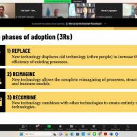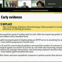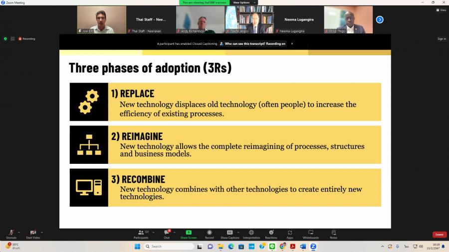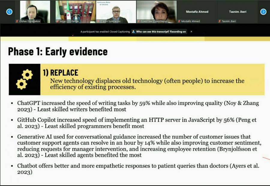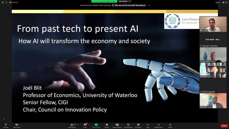 ก่อนที่จะมีการพิจารณารับรองข้อมติดังกล่าวในการประชุมสมัชชา IPU 149 ในเดือน ต.ค. 67 การประชุมฯ ในครั้งนี้ มี Ms. Neema Lugangira สมาชิกรัฐสภาแทนซาเนีย ในฐานะผู้ร่วมนำเสนอรายงาน (Co-rapporteur) ข้อมติเป็นผู้ดำเนินรายการ โดยมีวิทยากรจำนวน 3 ท่าน ได้แก่ Mr. Joel Blit ผู้ช่วยศาสตราจารย์ด้านเศรษฐศาสตร์ มหาวิทยาลัยวอเตอร์ลู แคนาดา Mr.Philip Thigo ที่ปรึกษารัฐบาลเคนยาและสมาชิกคณะที่ปรึกษาระดับสูงของสหประชาชาติว่าด้วยปัญญาประดิษฐ์ และ Mr. Tawfik Jelassi ผู้ช่วยผู้อำนวยการฝ่ายสารสนเทศ ยูเนสโก วิทยากรได้นำเสนอขั้นตอนของการดำเนินการเกี่ยวกับปัญญาประดิษฐ์ 3 ซึ่งมี 3 ขั้นตอนสำคัญ คือ 1) Replace (การแทนที่) เทคโนโลยีใหม่ ๆ เข้ามาแทนที่ โดยส่วนใหญ่เข้ามาแทนกำลังคน เพื่อเพิ่มประสิทธิภาพในกระบวนการที่ใช้อยู่ เช่น มอเตอร์ไฟฟ้าเข้ามาแทนที่เครื่องจักรไอน้ำในโรงงาน