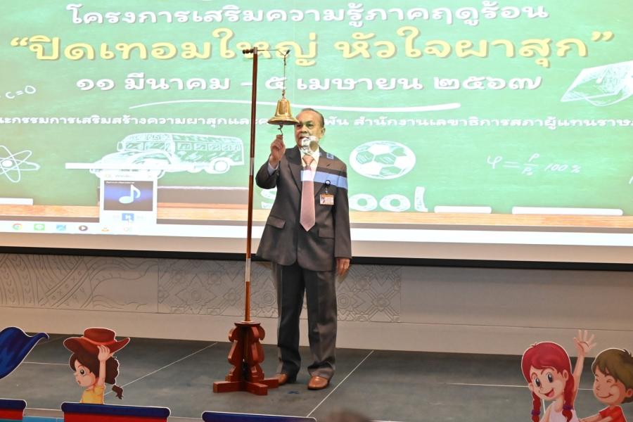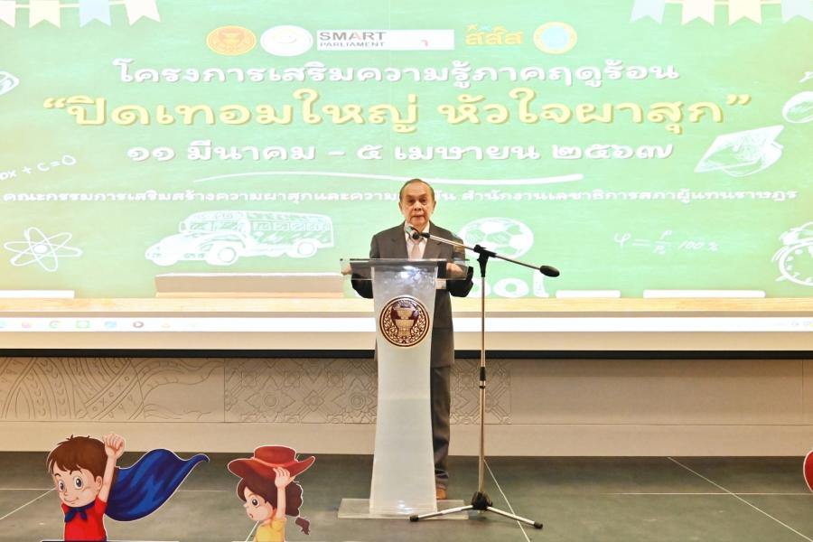 วันจันทร์ที่ 11 มีนาคม 2567 เวลา 09.00 นาฬิกา ณ ห้องประชุมสัมมนา B1 - 6 ชั้น B1 อาคารรัฐสภา นายวันมูหะมัดนอร์ มะทา ประธานสภาผู้แทนราษฎร มอบหมายให้ นายมุข สุไลมาน เลขานุการประธานสภาผู้แทนราษฎร เป็นประธานในพิธีเปิดโครงการเสริมความรู้ภาคฤดูร้อน "ปิดเทอมใหญ่ หัวใจผาสุก" โดยมี นางจงเดือน สุทธิรัตน์ ที่ปรึกษาด้านระบบงานนิติบัญญัติ กล่าวรายงาน ในการนี้ ผู้บริหารสำนักงานเลขาธิการสภาผู้แทนราษฎร คณบดีคณะครุศาสตร์ มหาวิทยาลัยสวนดุสิต คณะกรรมการเสริมสร้างความผาสุกและความผูกพันสำนักงานเลขาธิการสภาผู้แทนราษฎร คณะอนุกรรมการขับเคลื่อนการดำเนินการตามแผนเสริมสร้างความผาสุกและความผูกพันของสำนักงานเลขาธิการสภาผู้แทนราษฎร และข้าราชการ พนักงานราชการ และลูกจ้าง ร่วมพิธี