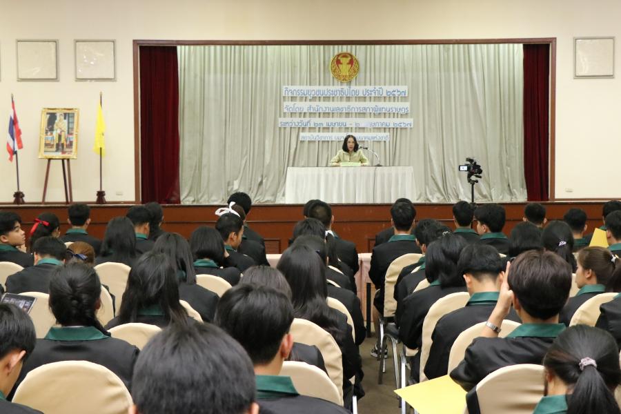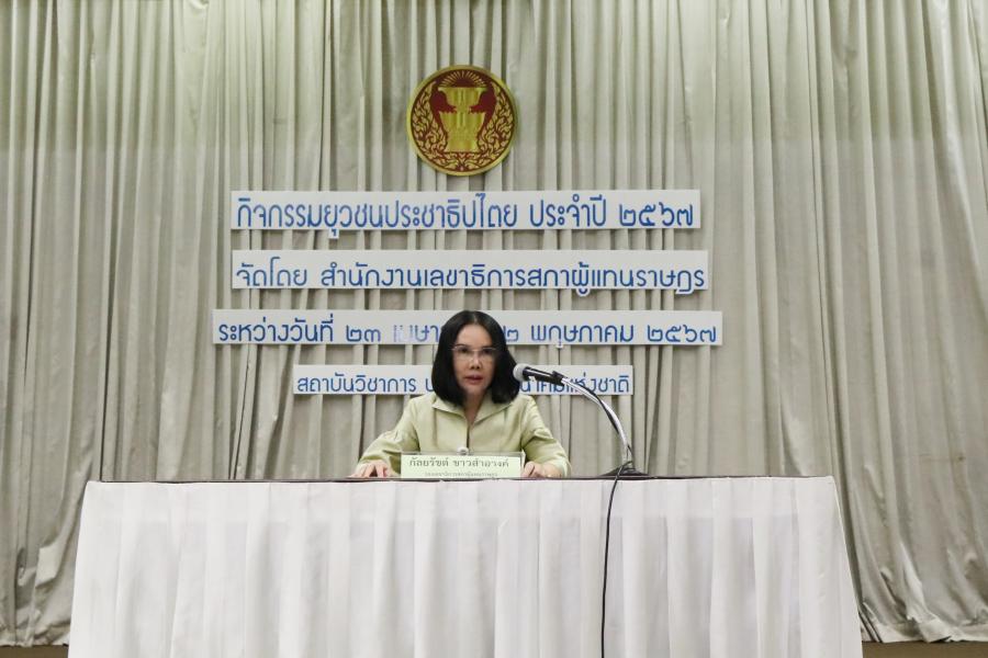 วันพฤหัสบดีที่ 2 พฤษภาคม 2567 เวลา 13.30 นาฬิกา ณ สถาบันวิชาการ บริษัท โทรคมนาคมแห่งชาติ (NT) จ.นนทบุรี น.ส.กัลยรัชต์ ขาวสำอางค์ รองเลขาธิการสภาผู้แทนราษฎร เป็นประธานในพิธีปิดกิจกรรมยุวชนประชาธิปไตย ประจำปี 2567 และมอบเกียรติบัตร พร้อมเข็มยุวชนฯ ให้แก่ยุวชนประชาธิปไตยฯ ที่ผ่านการอบรมรวมทั้งสิ้น 160 คน โดยมี นางฑิฆัมพร กาญจโนภาศ ผู้อำนวยการสำนักประชาสัมพันธ์ เป็นผู้กล่าวรายงาน