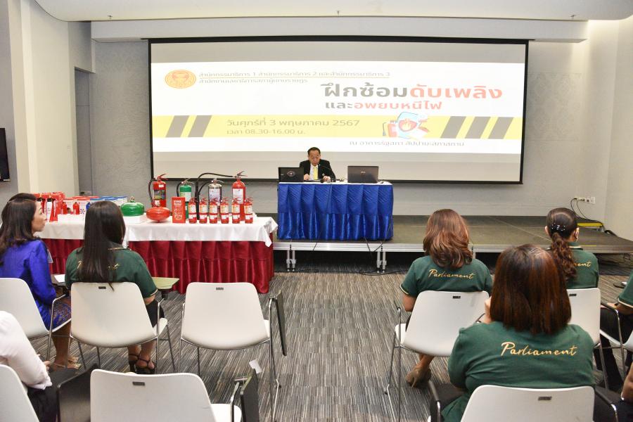 วันศุกร์ที่ 3 พฤษภาคม 2567 เวลา 08.45 นาฬิกา ณ ห้องประชุมสัมมนา B1 6 ชั้น B1 อาคารรัฐสภา นายศิโรจน์ แพทย์พันธุ์ รองเลขาธิการสภาผู้แทนราษฎร เป็นประธานในพิธีเปิดโครงการฝึกอบรมเชิงปฏิบัติการ การฝึกซ้อมตามแผนฉุกเฉินเพื่อป้องกันและระงับเหตุอัคคีภัย จัดโดยสำนักกรรมาธิการ 1 สำนักกรรมาธิการ 2 และสำนักกรรมาธิการ 3 โดยมีผู้บริหารและบุคลากรของสำนักงานฯ เข้าร่วมโครงการ