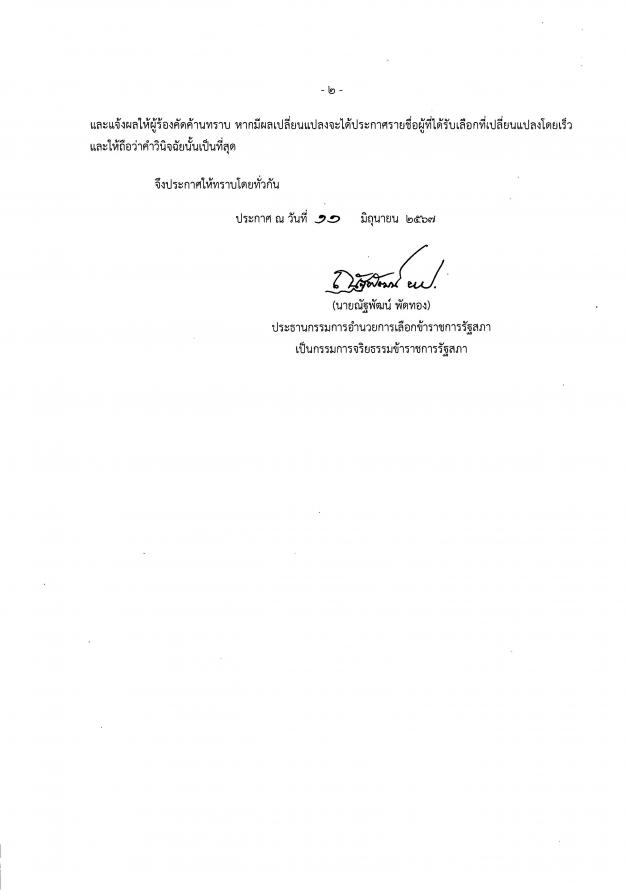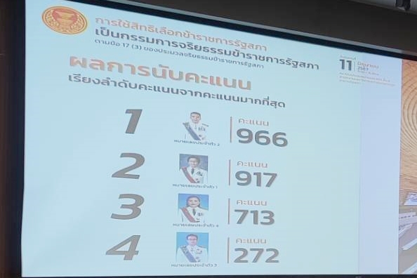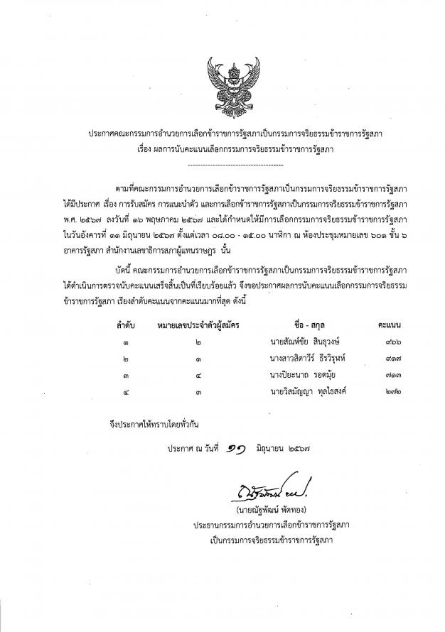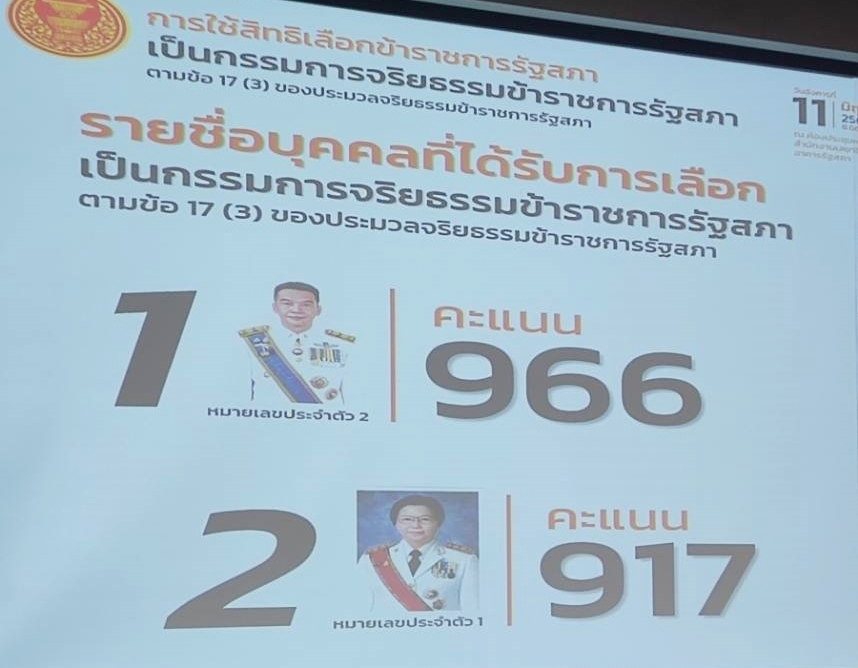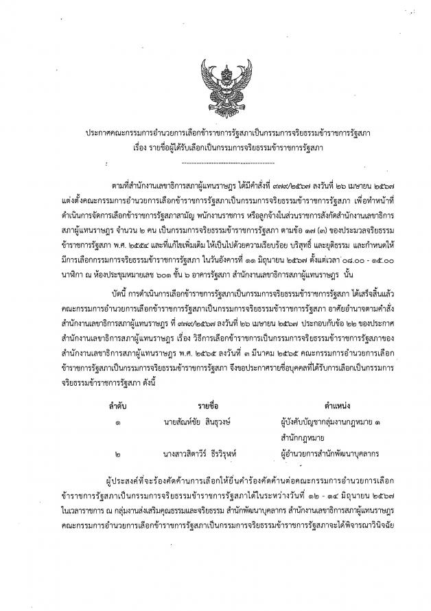 | วันอังคารที่ 11 มิถุนายน 2567 เวลา 15.00 นาฬิกา ณ ห้องประชุม 601 ชั้น 6 อาคารรัฐสภา นายณัฐพัฒน์ พัดทอง ประธานกรรมการอำนวยการเลือกข้าราชการรัฐสภาสามัญเป็นกรรมการจริยธรรมข้าราชการรัฐสภา ประกาศรายชื่อบุคคลที่ได้รับเลือกเป็นกรรมการจริยธรรมข้าราชการรัฐสภา ตามข้อ 17(3) ของประมวลจริยธรรมข้าราชการรัฐสภา ซึ่งผู้ที่ได้รับเลือกเป็นกรรมการจริยธรรมข้าราชการรัฐสภา ได้แก่ 1. นายสัณห์ชัย สินธุวงษ์ ผู้บังคับบัญชากลุ่มงานกฎหมาย 1 สำนักกฎหมาย ได้ 966 คะแนน 2. น.ส.สิตาวีร์ ธีรวิรุฬห์ ผู้อำนวยการสำนักพัฒนาบุคลากร ได้ 917 คะแนน