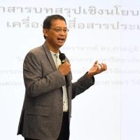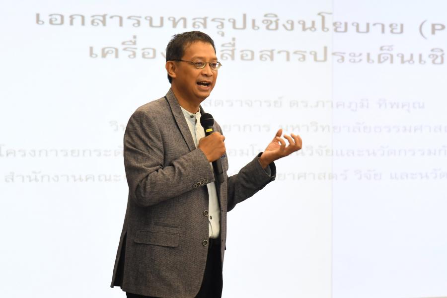 จากนั้น เป็นการบรรยายเรื่อง "Policy Brief ในฐานะเครื่องมือสื่อสารประเด็นเชิงโยบาย" โดยได้รับเกียรติจาก รองศาสตราจารย์ ดร.ภาคภูมิ ทิพคุณ ผู้อำนวยการหลักสูตรปรัชญาดุษฏีบัณฑิต สาขาวิชาสหวิทยาการ วิทยาลัยสหวิทยาการ ม.ธรรมศาสตร์ และหัวหน้าโครงการยกระดับกลไกการเชื่อมโยงงานวิจัยและนวัตกรรมกับฝ่ายนิติบัญญัติ(PRP) สำนักงานคณะกรรมการส่งเสริมวิทยาศาสตร์ วิจัย และนวัตกรรม (สกสว.)