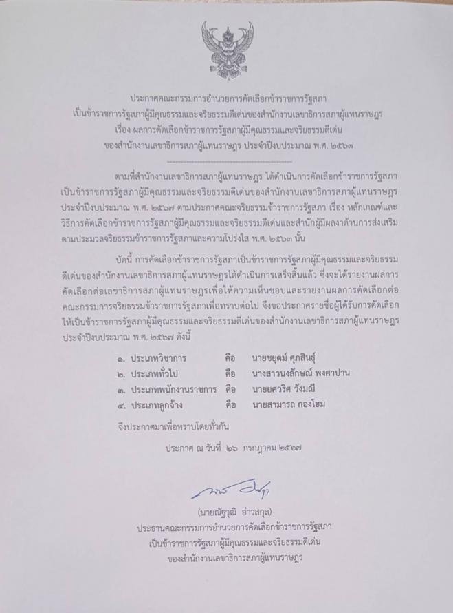 คณะกรรมการอำนวยการคัดเลือกข้าราชการรัฐสภาเป็นข้าราชการสภาผู้มีคุณธรรมและจริยธรรมดีเด่นของสำนักงานเลขาธิการสภาผู้แทนราษฎรประจำปีงบประมาณ 2567 จัดให้มีการลงคะแนนเลือกข้าราชการรัฐสภาผู้มีคุณธรรมและจริยธรรมดีเด่น ผ่านระบบ E Voting ทั้งนี้ ผลการคัดเลือกผู้มีคุณธรรมและจริยธรรมดีเด่นประจำปีงบประมาณ พ.ศ. 2567 มีดังนี้