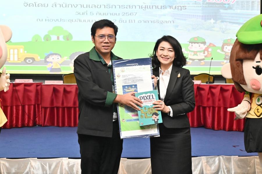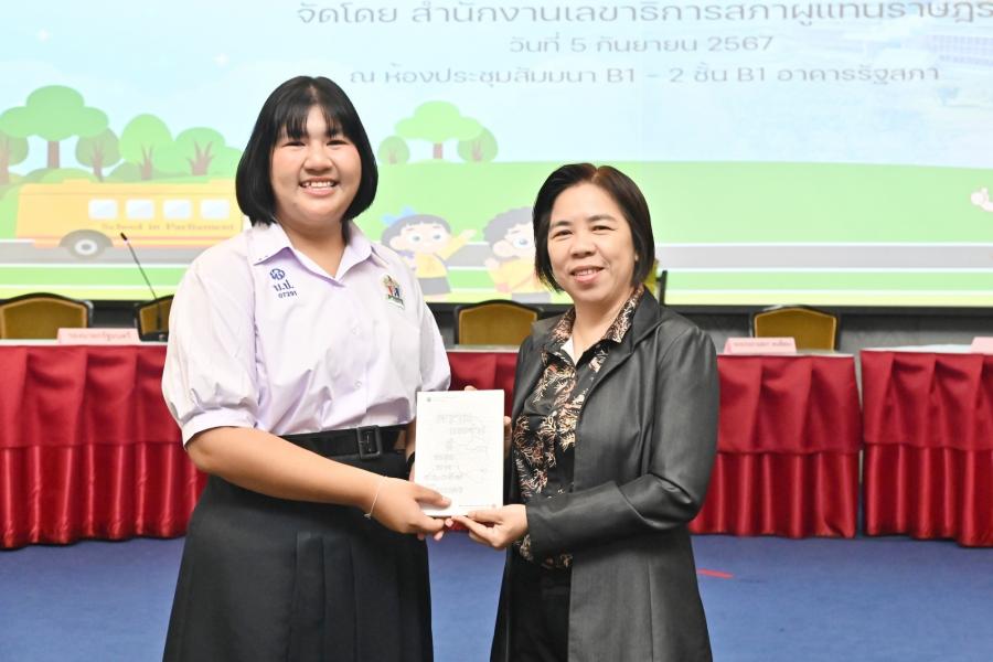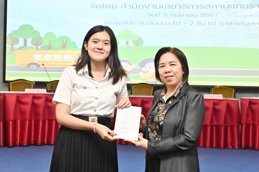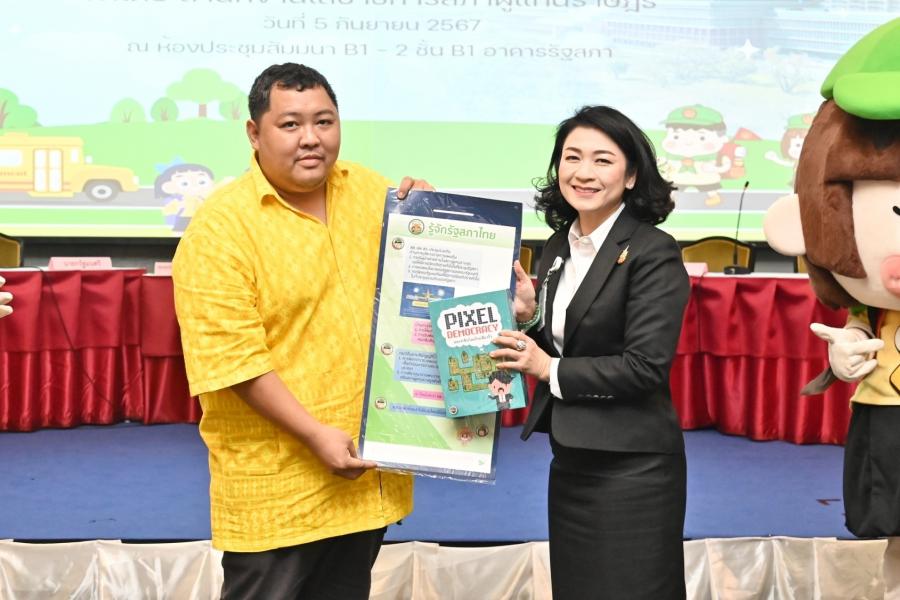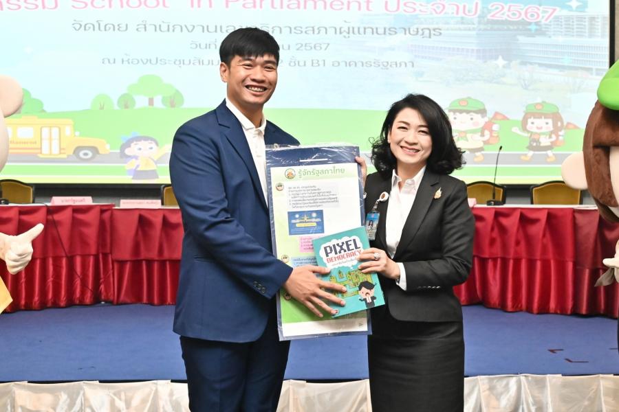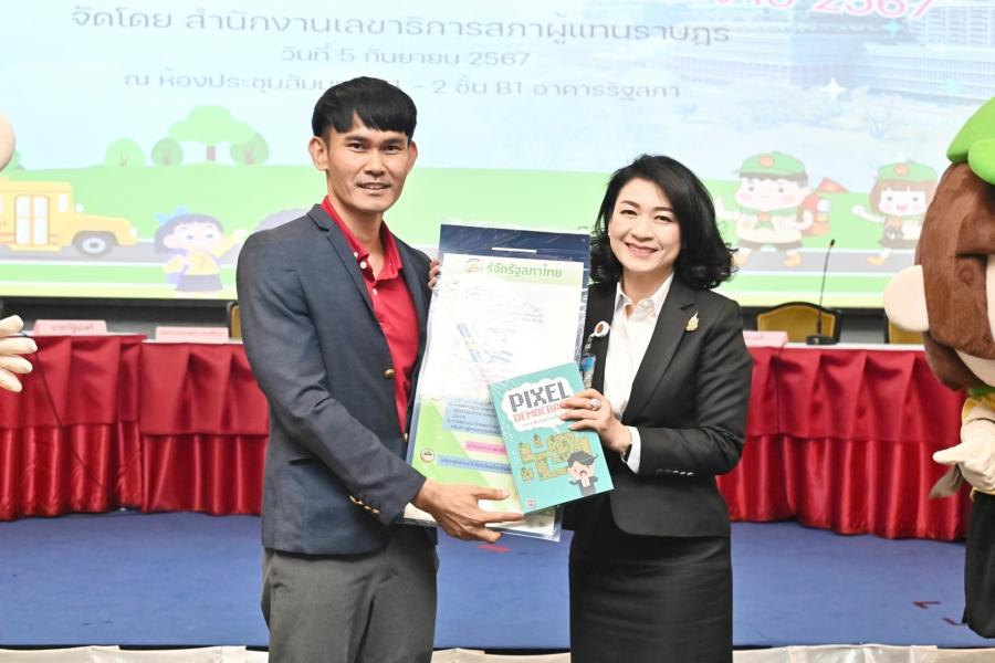 วันพฤหัสบดีที่ 5 กันยายน 2567 เวลา 09.30 นาฬิกา ณ ห้องจัดประชุมสัมมนา B1 - 2 ชั้น B1 อาคารรัฐสภา นางจงเดือน สุทธิรัตน์ รองเลขาธิการสภาผู้แทนราษฎร กล่าวต้อนรับผู้เข้าร่วมโครงการต้นกล้ารัฐสภา ประจำปี 2567 กิจกรรม School in Parliament พร้อมทั้งมอบสื่อความรู้และเกมประชาธิปไตยให้กับตัวแทนครู อาจารย์โรงเรียนที่เข้าร่วมกิจกรรม เพื่อนำไปใช้ขยายผลความรู้ด้านประชาธิปไตยให้กับนักเรียนในโรงเรียน และนางสาวมันทนา ศรีเพ็ญประภา ผู้บังคับบัญชากลุ่มงานเผยแพร่ประชาธิปไตยและกิจกรรมสภาผู้แทนราษฎร สำนักประชาสัมพันธ์ มอบหนังสือรวมเรื่องสั้นและบทกวีการเมืองรางวัลพานแว่นฟ้า เพื่อเป็นรางวัลให้แก่ผู้ที่ได้คะแนนการทดสอบ Pre-Test สูง