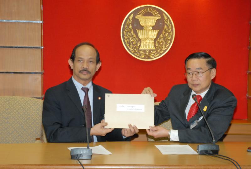 นายวัฒนา เซ่งไพเราะ โฆษกประธานสภาผู้แทนราษฎร รับยื่นหนังสือถึงนายสมศักดิ์ เกียรติสุรนน์ ประธานรัฐสภา และประธานสภาผู้แทนราษฎร จากนายเหวง โตจิราการ สมาชิกสภาผู้แทนราษฎร บัญชีราชชื่อ พรรคเพื่อไทย และแกนนำคนเสื้อแดง