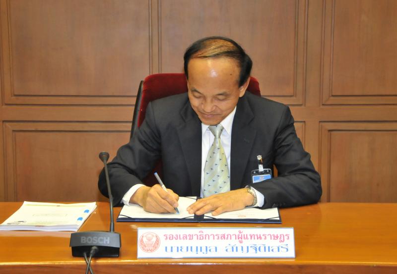 วันพฤหัสบดีที่ ๖ ธันวาคม ๒๕๕๕ เวลา ๑๕.๐๐ นาฬิกา นายนุกูล สัญฐิติเสรี  รองเลขาธิการสภาผู้แทนราษฎร ร่วมลงนามคำรับรองปฎิบัติราชการ ประจำปี พ.ศ.๒๕๕๖ กับผู้อำนวยการสำนักภายใต้การกำกับดูแล