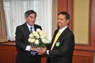 นายจเร พันธุ์เปรื่อง เลขาธิการสภาผู้แทนราษฎร รับมอบแจกันดอกไม้จาก นายสมพงษ์ ปรีชาธนพจน์