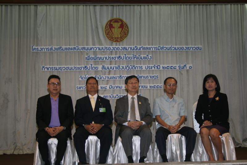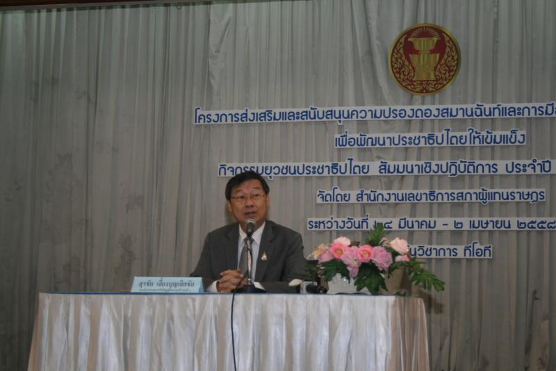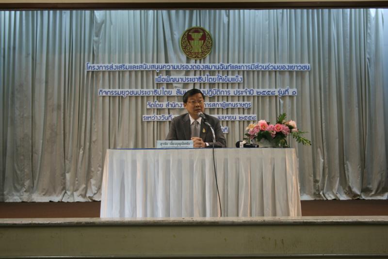 วันพุธที่ ๒๕ มีนาคม ๒๕๕๘ ณ สถาบันวิชาการทีโอที จ.นนทบุรี นายสุรชัย เลี้ยงบุญเลิศชัย รองประธานสภานิติบัญญัติแห่งชาติ คนที่หนึ่ง เป็นประธานในพิธีเปิดโครงการส่งเสริมและสนับสนุนความปรองดองสมานฉันท์และการมีส่วนร่วมของเยาวชนเพื่อพัฒนาประชาธิปไตยให้เข้มแข็ง กิจกรรมยุวชนประชาธิปไตยสัมมนาเชิงปฏิบัติการประจำปี ๒๕๕๘ รุ่นที่ ๑ ระหว่างวันที่ ๒๔ มีนาคม ถึง ๒ เมษายน ๒๕๕๘ โดยมี นายจเร พันธุ์เปรื่อง เลขาธิการสภาผู้แทนราษฎร เป็นผู้กล่าวรายงาน