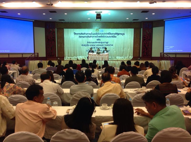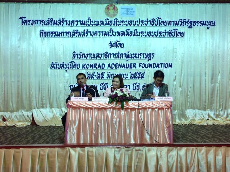 วันพฤหัสบดีที่ ๒๕ มิถุนายน ๒๕๕๘ เวลา ๑๐.๐๐ นาฬิกา ณ โรงแรมบีพี สมิหลาบีช อำเภอเมือง จังหวัดสงขลา สำนักงานเลขาธิการสภาผู้แทนราษฎร โดยกลุ่มงานเผยแพร่ประชาธิปไตยและกิจกรรมสภาผู้แทนราษฎร สำนักประชาสัมพันธ์ จัดโครงการเสริมสร้างความเป็นพลเมืองในระบอบประชาธิปไตยตามวิถีรัฐธรรมนูญ กิจกรรมการเสริมสร้างความเป็นพลเมืองในระบอบประชาธิปไตย ณ ภาคใต้ โดยได้มีการเสวนา หัวข้อ "สร้างพลเมืองให้เป็นใหญ่...ทำได้อย่างไร" โดย นายขจรศักดิ์ เจริญโสภา หัวหน้าสำนักงานจังหวัดสงขลา นายคัมภีร์ ทองพูน รองคณบดีคณะรัฐศาสตร์ มหาวิทยาลัยหาดใหญ่ และนางสาวศุภระวรรณ นฤชาติ นักสื่อสารมวลชนชำนาญการ สถานีวิทยุกระจายเสียงแห่งประเทศไทย จังหวัดสงขลา เป็นผู้ดำเนินรายการ |