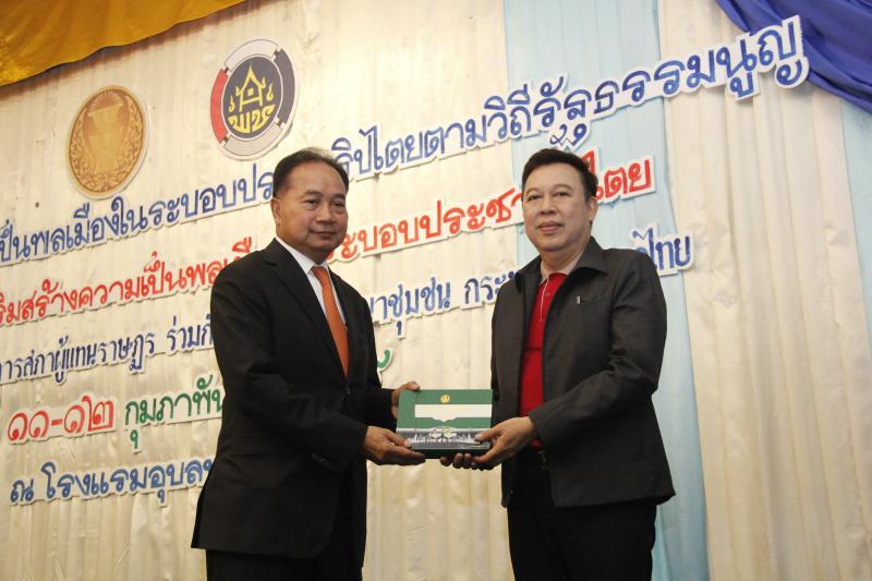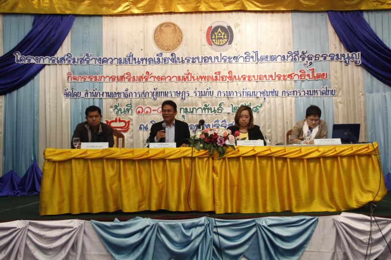สำนักงานเลขาธิการสภาผู้แทนราษฎร จัดโครงการเสริมสร้างความเป็นพลเมืองในระบอบประชาธิปไตยตามวิถีรัฐธรรมนูญ กิจกรรมการเสริมสร้างความเป็นพลเมืองในระบอบประชาธิปไตย ณ ภาคตะวันออกเฉียงเหนือ ระหว่างวันที่ ๑๑ ๑๒ กุมภาพันธ์ ๒๕๕๙ ณ โรงแรมอุบลบุรีรีสอร์ท อำเภอวารินชำราบ จังหวัดอุบลราชธานี โดยมีวัตถุประสงค์เพื่อเสริมสร้างความรู้ ความเข้าใจ เกี่ยวกับสิทธิ เสรีภาพ หน้าที่ และความรับผิดชอบของพลเมืองในระบอบประชาธิปไตย ตลอดจนเพื่อให้กลุ่มเป้าหมายซึ่งเป็นผู้นำชุมชนใน จ.อุบลราชธานี จำนวน ๑๒๐ ได้ตระหนักถึงความสำคัญของการเป็นพลเมืองไทย และพร้อมเข้าสู่การเป็นพลเมืองอาเซียนต่อไป โดยมี นายสุชน ชาลีเครือ สมาชิกสภาขับเคลื่อนการปฏิรูปประเทศ เป็นประธานเปิดการสัมมนา และนางจงเดือน สุทธิรัตน์ ผู้อำนวยการสำนักประชาสัมพันธ์ เป็นผู้กล่าวรายงาน โดยการเข้าร่วมกิจกรรมดังกล่าว จะได้เรียนรู้ทั้งภาคทฤษฎี และภาคปฏิบัติ จากการรับฟังการบรรยาย เรื่อง พลเมืองในระบอบประชาธิปไตยกับการปฏิรูปประเทศอย่างยั่งยืน พลเมือง...กับการขับเคลื่อนประชาคมอาเซียนหลังปี ๒๐๑๕ การเสวนาแลกเปลี่ยนความคิดเห็นเกี่ยวกับ พลเมืองกับการมีส่วนร่วมในการปฏิรูปประเทศ รวมถึงการทำกิจกรรมเพื่อส่งเสริมการมีส่วนร่วมและพัฒนาเครือข่ายผู้นำชุมชน ทั้งนี้ การที่ผู้นำชุมชนได้เข้าร่วมกิจกรรมดังกล่าว นอกจากจะเป็นโอกาสอันดีที่ จะได้รับความรู้เกี่ยวกับความเป็นพลเมืองในระบอบประชาธิปไตยแล้ว ยังมีโอกาสได้ร่วมแลกเปลี่ยนความคิดเห็นเกี่ยวกับการมีส่วนร่วมในการพัฒนาชุมชน อันเป็นการส่งเสริมให้ผู้นำชุมชนได้ฝึกทักษะการคิดวิเคราะห์อย่างมีเหตุผลเพื่อให้สามารถนำไปใช้ในชีวิตจริงได้อย่างเหมาะสม และจะช่วยพัฒนาผู้นำชุมชนให้เป็นบุคคลที่มีศักยภาพเพื่อเป็นต้นแบบคนดี คนเก่ง และอยู่ในสังคมได้อย่างมีความสุข ตลอดจนสามารถนำความรู้ที่ได้รับกลับไปเผยแพร่ในชุมชนของตนเองต่อไป