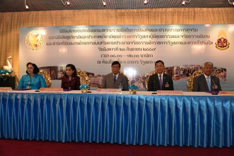 วันอังคารที่ ๒๐ กันยายน ๒๕๕๙ เวลา ๐๙.๓๐ นาฬิกา ณ บริเวณห้องโถง อาคารรัฐสภา ๑ ศาสตราจารย์พิเศษ พรเพชร วิชิตชลชัย ประธานสภานิติบัญญัติแห่งชาติ เป็นประธานในพิธีลงนามบันทึกข้อตกลงความร่วมมือในการป้องกันและปราบปรามการทุจริต ระหว่างสำนักงานคณะกรรมการป้องกันและปราบปรามการทุจริตแห่งชาติ โดย นายสรรเสริญ พลเจียก เลขาธิการคณะกรรมการป้องกันและปราบปรามการทุจริตแห่งชาติสำนักงานเลขาธิการวุฒิสภา โดยนางวรารัตน์ อติแพทย์ เลขาธิการวุฒิสภา และสำนักงานเลขาธิการสภาผู้แทนราษฎร โดยนางสายทิพย์ เชาวลิตถวิล เลขาธิการสภาผู้แทนราษฎร โดยมี ศาสตราจารย์พิเศษ พรเพชร วิชิตชลชัย ประธานสภานิติบัญญัติแห่งชาติ และพลตำรวจเอก วัชรพล ประสารราชกิจ ประธานกรรมการป้องกันและปราบปรามการทุจริตแห่งชาติ เป็นสักขีพยานโดยมีวัตถุประสงค์เพื่อสร้างเครือข่ายทางวิชาการ และขยายความร่วมมือในการดำเนินการด้านคุณธรรมและจริยธรรม การป้องกันและต่อต้านการทุจริตทุกรูปแบบ รวมทั้งส่งเสริม สนับสนุน เผยแพร่ และเสริมสร้างทัศนคติค่านิยมในความซื่อสัตย์สุจริต ตลอดจนขับเคลื่อนยุทธศาสตร์ชาติว่าด้วยการป้องกันและปราบปรามการทุจริต จากนั้น ศาสตราจารย์พิเศษ พรเพชร วิชิตชลชัย ประธานสภานิติบัญญัติแห่งชาติ เป็นประธานมอบเข็มเชิดชูเกียรติและโล่ยกย่องประกาศเกียรติคุณ แก่ข้าราชการรัฐสภา ที่ได้รับคัดเลือกเป็นข้าราชการรัฐสภาผู้มีคุณธรรมและจริยธรรมดีเด่น จำนวน ๘ คน ดังนี้ ๑. ข้าราชการรัฐสภาสามัญ ประเภทวิชาการ - สำนักงานเลขาธิการสภาผู้แทนราษฎร ได้แก่ พันจ่าอากาศเอก ศักดิ์สิทธิ์ ภู่สิโรรังษี - สำนักงานเลขาธิการวุฒิสภา ได้แก่ นางศิริวรรณ สุทธิพงศ์ ๒. ข้าราชการรัฐสภาสามัญ ประเภททั่วไป - สำนักงานเลขาธิการสภาผู้แทนราษฎร ได้แก่ นางสาวสายฝน ไกรสมเลิศ - สำนักงานเลขาธิการวุฒิสภา ได้แก่ นายสุพล พิรักษา ๓. พนักงานราชการ - สำนักงานเลขาธิการสภาผู้แทนราษฎร ได้แก่ นางสาวศิริวิมล สุขสมบุญ - สำนักงานเลขาธิการวุฒิสภา ได้แก่ นางสาวมนสุดา พุ่มพวง ๔. ลูกจ้าง - สำนักงานเลขาธิการสภาผู้แทนราษฎร ได้แก่ นายสามารถ กองโฮม - สำนักงานเลขาธิการวุฒิสภา ได้แก่ นายรุ่งโรจน์ สาหร่ายทอง และมอบโล่ประกาศเกียรติคุณและเกียรติบัตรแก่สำนักที่มีผลงานด้านการส่งเสริมตามประมวลจริยธรรมข้าราชการรัฐสภาและความโปร่งใสจำนวน ๖ สำนัก ดังนี้ รางวัลระดับดีเด่น ๑. รางวัลระดับดีเด่น - สำนักงานเลขาธิการสภาผู้แทนราษฎร ได้แก่ สำนักกรรมาธิการ ๓ - สำนักงานเลขาธิการวุฒิสภา ได้แก่ สำนักนโยบายและแผน ๒. รางวัลระดับ