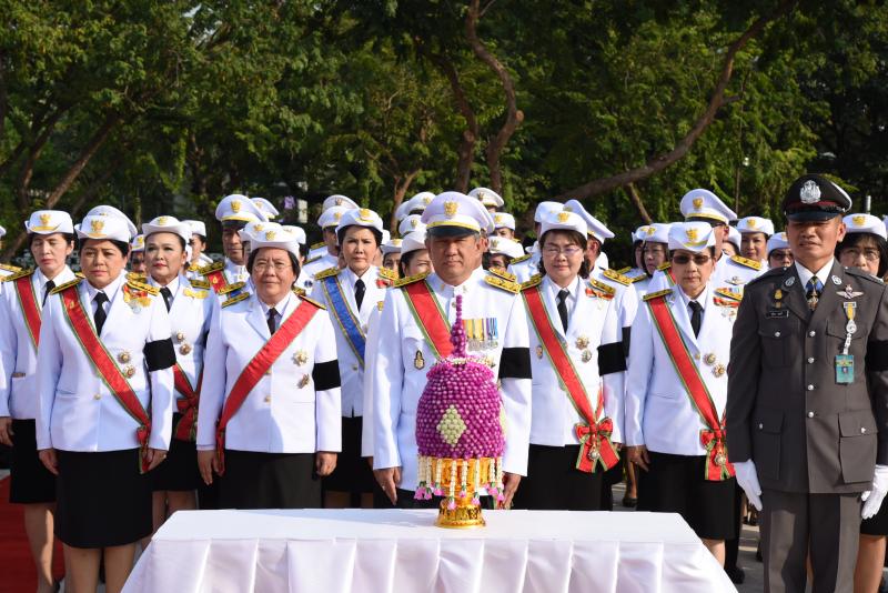 ข้าราชการสำนักงานเลขาธิการสภาผู้แทนราษฎรนำพานประดับพุ่มดอกไม้ ถวายบังคม ในนาม