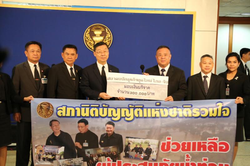วันอังคารที่ ๘ สิงหาคม ๒๕๖๐ เวลา ๑๓.๔๕ นาฬิกา ณ บริเวณห้องโถง อาคารรัฐสภา ๑ นายสุรชัย เลี้ยงบุญเลิศชัย  รองประธานสภานิติบัญญัติแห่งชาติ คนที่หนึ่ง รับมอบเงินจำนวน ๓๐๐,๐๐๐ บาท จากนายบุญยงค์ ยังเจริญรัฐ ผู้แทนสมาคมนักธุรกิจไทยยุคใหม่ไทย - จีน และรับมอบเงินจำนวน ๙๖,๒๗๕ บาท จากดร. ดวงฤทธิ์ เบญญาธิกุล ชัยรุ่งเรือง รองอธิการบดีฝ่ายกิจการนักศึกษา มหาวิทยาลัยกรุงเทพธนบุรี เพื่อนำไปช่วยเหลือผู้ประสบภัยน้ำท่วมตามโครงการสภานิติบัญญัติแห่งชาติรวมใจช่วยเหลือผู้ประสบภัยน้ำท่วม