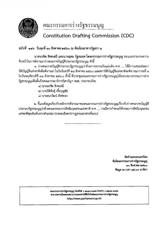วันพฤหัสบดีที่ ๓๑ สิงหาคม ๒๕๖๐ ทั้งนี้ที่ประชุมคณะกรรมการร่างรัฐธรรมนูญ ได้มอบหมายกรรมการร่างรัฐธรรมนูญ