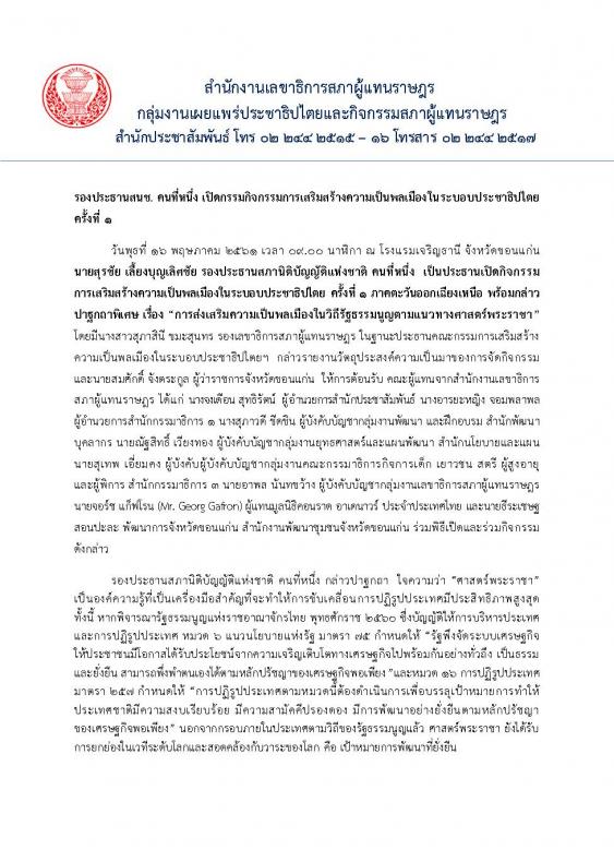 รองประธานสนช. คนที่หนึ่ง เปิดกรรมกิจกรรมการเสริมสร้างความเป็นพลเมืองในระบอบประชาธิปไตย ครั้งที่ ๑
