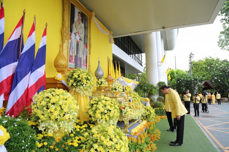 ความเคารพพระฉายาลักษณ์สมเด็จพระเจ้าอยู่หัว พร้อมเปิดกรวยกระทงดอกไม้หน้าพระฉายาลักษณ์