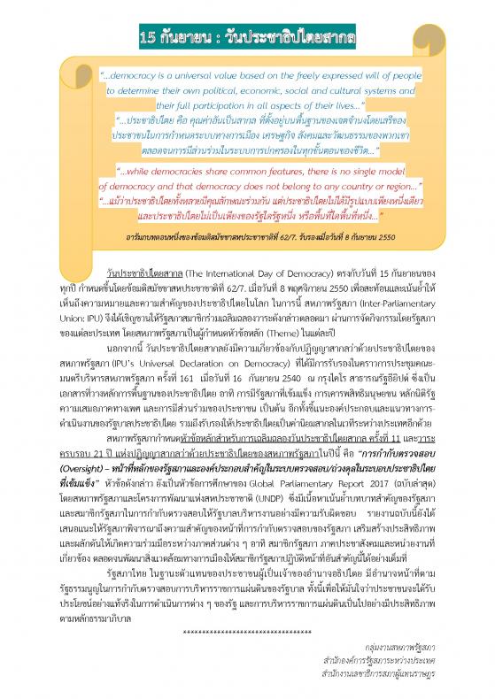 ให้เห็นถึงความหมายและความสำคัญของประชาธิปไตยในโลก ในการนี้ สหภาพรัฐสภา (Inter-Parliamentary