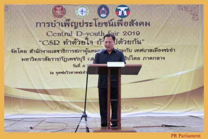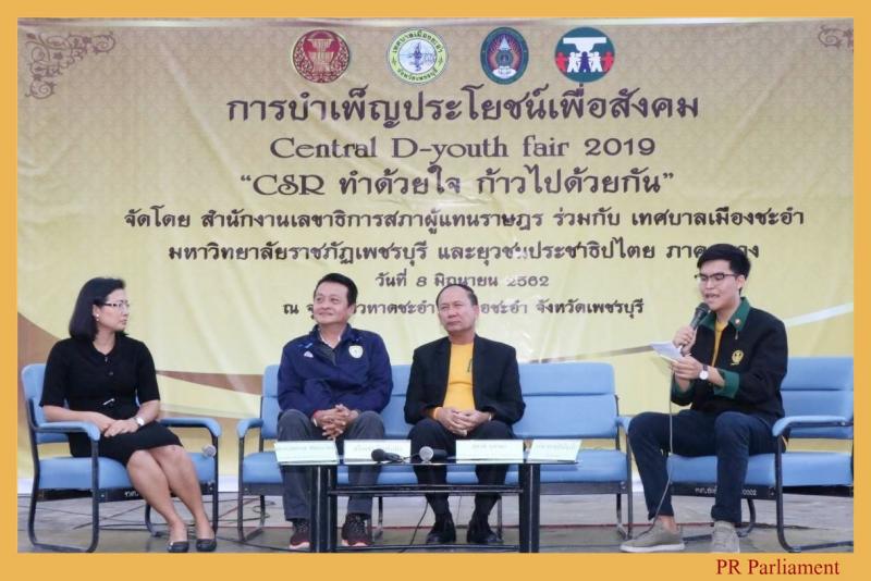 | เมื่อวันเสาร์ที่ ๘ มิถุนายน ๒๕๖๒ เวลา ๑๖.๓๐ นาฬิกา ณ โรงแรม ลองบีช ชะอำ จังหวัดเพชรบุรี นายนุกูล พรสมบูรณ์ศิริ นายกเทศมนตรีเมืองชะอำ จังหวัดเพชรบุรี ให้เกียรติเป็นประธานในพิธีเปิดกิจกรรม การบำเพ็ญประโยชน์เพื่อสังคม Central D-youth Fair 2019 CSR ทำด้วยใจ ก้าวไปด้วยกัน โดยมี นางจงเดือน สุทธิรัตน์ ผู้อำนวยการสำนักประชาสัมพันธ์ กล่าวรายงาน พร้อมกันนี้ได้กล่าวขอบคุณ นายกเทศมนตรีเมืองชะอำ อธิการบดี มหาวิทยาลัยราชภัฏเพชรบุรี ผู้อำนวยการโรงเรียนชะอำคุณหญิงเนื่องบุรี และผู้อำนวยการโรงเรียนห้วยทรายประชาสรรค์ ที่ให้ความร่วมมือในการจัดกิจกรรมการบำเพ็ญประโยชน์ เพื่อสังคมในครั้งนี้ ในโอกาสนี้ยุวชนประชาธิปไตยได้รำถวายพระพรชัยมงคลรัชกาลที่ ๑๐ ธ มิ่งขวัญประชา มหาวชิราลงกรณ และได้ร่วมกับนักเรียนโรงเรียนชะอำคุณหญิงเนื่องบุรี จ.เพชรบุรี กล่าวถวายราชสดุดี เฉลิมพระเกียรติพระบาทสมเด็จพระเจ้าอยู่หัว พร้อมกันนี้ยังได้ร่วมกับนักเรียนโรงเรียนห้วยทรายประชาสรรค์ จังหวัดเพชรบุรี กล่าวสุนทรพจน์ หัวข้อ ส.ส.ในฝันของฉัน ในการนี้ นายสุชาติ อุสาหะ สมาชิกสภาผู้แทน ราษฎรจังหวัดเพชรบุรี ให้เกียรติมอบของที่ระลึกแก่ผู้กล่าวสุนทรพจน์ และนางจงเดือน สุทธิรัตน์ ผู้อำนวยการ สำนักประชาสัมพันธ์ มอบของที่ระลึกเพื่อแสดงความขอบคุณแก่นายกเทศมนตรีเมืองชะอำ จังหวัดเพชรบุรี ต่อจากนั้นเป็นการเสวนา ในหัวข้อ "เยาวชนรุ่นใหม่ร่วมใจพัฒนาท้องถิ่นโดยมี นายสุชาติ อุสาหะ สมาชิก สภาผู้แทนราษฎรจังหวัดเพชรบุรี นายศรีเพชร อินพันทัง รองปลัดเทศบาลเมืองชะอำ และ ผศ.ณัชชานุช พิชิตธนารัตน์ อาจารย์ประจำคณะมนุษยศาสตร์และสังคมศาสตร์ มหาวิทยาลัยราชภัฏเพชรบุรี ร่วมเสวนา ดำเนินรายการโดย นายธาริน หลายศิริเรืองไร ยุวชนประชาธิปไตย นายสุชาติ อุสาหะ กล่าวว่า เยาวชนควรเข้ามาส่วนร่วมตั้งแต่ระดับชุมชน เพื่อส่งเสริมให้ท้องถิ่นมีความ เข้มแข็ง และพัฒนาประเทศไปในทิศทางที่ดีขึ้น ด้านนายศรีเพชร อินพันทัง กล่าวว่า องค์กรในระดับท้องถิ่น ถือเป็นเครื่องจักรในการให้เยาวชนเข้ามา มีส่วนร่วมที่ต่อยอดจากการศึกษาทั่วไป เพื่อมาแลกเปลี่ยนความรู้ในการจัดกิจกรรมต่าง ๆ และขอให้เยาวชน ใช้สื่อโซเชียลในการค้นคว้าข้อมูลที่เป็นประโยชน์ต่อการพัฒนาประเทศ ขณะที่ ผศ.ณัชชานุช พิชิตธนารัตน์ กล่าวว่า หากเราวางรากฐานที่ดีให้แก่เยาวชน ก็จะกลายเป็นพลเมือง ที่ดี อีกทั้งควรมุ่งเน้นเรื่องคุณธรรมและจริยธรรมให้มากขึ้น โอกาสนี้ นางจงเดือน สุทธิรัตน์ ผู้อำนวยการ สำนักประชาสัมพันธ์ มอบของที
