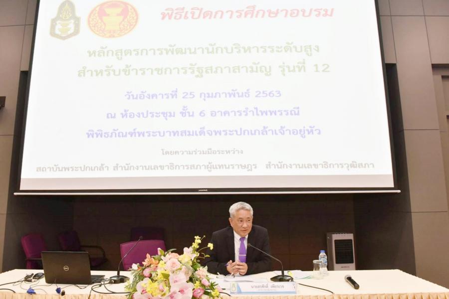วันอังคารที่ ๒๕ กุมภาพันธ์ ๒๕๖๓ เวลา ๐๙.๑๕ นาฬิกา ณ ห้องประชุม ชั้น ๖ อาคารรำไพพรรณี พิพิธภัณฑ์พระบาทสมเด็จพระปกเกล้าเจ้าอยู่หัว นายสรศักดิ์ เพียรเวช เลขาธิการสภาผู้แทนราษฎร เป็นประธานในพิธีเปิดการศึกษาอบรมหลักสูตรการพัฒนานักบริหารระดับสูง สำหรับข้าราชการ รัฐสภาสามัญ รุ่นที่ ๑๒ โดยความร่วมมือระหว่างสำนักงานเลขาธิการสภาผู้แทนราษฎร สำนักงาน เลขาธิการวุฒิสภา และสถาบันพระปกเกล้า โอกาสนี้ เลขาธิการสภาผู้แทนราษฎรได้กล่าวให้โอวาท แก่นักศึกษาใจความตอนหนึ่งว่า เลขาธิการสภาผู้แทนราษฎรได้ให้ความสำคัญกับการอบรมหลักสูตร ดังกล่าวเป็นอย่างมาก เนื่องจากเป็นหลักสูตรที่คณะกรรมการข้าราชการรัฐสภา (ก.ร.) เห็นชอบให้ จัดขึ้นเพื่อเป็นส่วนหนึ่งในกระบวนการพัฒนาสมรรถนะและเพิ่มพูนขีดความสามารถของข้าราชการ รัฐสภาเพื่อเตรียมความพร้อมก่อนเข้าสู่ตำแหน่งผู้บริหารระดับสูงของรัฐสภา รวมถึงการสร้างเครือข่าย และการประสานงานที่ดีของข้าราชการทั้งสองสำนักงานจึงขอให้นักศึกษาตั้งใจศึกษาหาความรู้จาก หลักสูตรนี้ และนำความรู้ ทักษะ ประสบการณ์ที่ได้รับไปใช้ให้เกิดประโยชน์ต่อสำนักงานฯ รวมทั้ง ขอให้เก็บเกี่ยวและจดจำประสบการณ์การทำงานในด้านต่าง ๆ ที่ผ่านมาในอดีตเพื่อนำมาใช้ให้เกิดประโยชน์ ต่อการทำงานในปัจจุบัน และปรับวิธีการเรียนรู้ พร้อมทั้งปรับปรุงการทำงานให้ดีขึ้น ตลอดจนขอให้เป็น ผู้ที่คิดบวกต่อปัญหาทุกปัญหาที่ประสบ โดยหากสามารถแก้ไขปัญหาต่าง ๆ ได้จะส่งผลให้เกิดความสำเร็จ ในที่สุด ทั้งนี้ ขอให้ทุกคนมีความอดทน มุ่งมั่น และยึดหลักนโยบายของประธานสภาผู้แทนราษฎรในการ ปฏิบัติหน้าที่ด้วยความซื่อสัตย์ สุจริต ถูกต้อง ยุติธรรม โปร่งใส ตรวจสอบได้ และมุ่งมั่นสนับสนุนก ารทำงานของสถาบันนิติบัญญัติเพื่อประโยชน์สูงสุดต่อประเทศชาติและประชาชน จากนั้น นายศิโรจน์ แพทย์พันธุ์ ที่ปรึกษาด้านระบบงานนิติบัญญัติ รักษาราชการแทนผู้อำนวยการ สำนักงาเลขานุการ ก.ร. เป็นวิทยากรบรรยายพิเศษเรื่อง "ระบบการพัฒนาศักยภาพการบริหารเพื่อ ความก้าวหน้าในสายงาน"