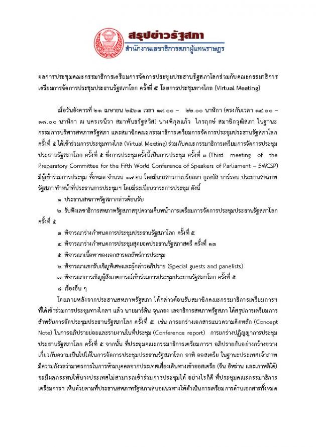 เตรียมการจัดการประชุมประธานรัฐสภาโลก ครั้งที่ ๕ เข้าร่วมการประชุมทางไกล