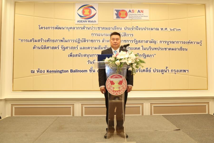 โครงการพัฒนาบุคลากรด้านประชาคมอาเซียน ประจำปีงบประมาณพ.ศ.๒๕๖๓ หลักสูตร "การบูรณาการองค์ความรู้ด้านนิติศาสตร์รัฐศาสตร์ และความสัมพันธ์ระหว่างประเทศในบริบทประชาคมอาเซียนเพื่อสนับสนุนการปฏิบัติหน้าที่ของสมาชิกรัฐสภา"