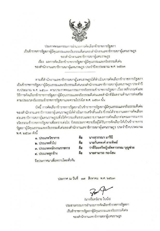 การประกาศผลการคัดเลือกข้าราชการรัฐสภาเป็นข้าราชการรัฐสภาผู้มีคุณธรรมและจริยธรรมดีเด่นของสำนักงานเลขาธิการสภาผู้แทนราษฎร ประจำปีงบประมาณ ๒๕๖๓