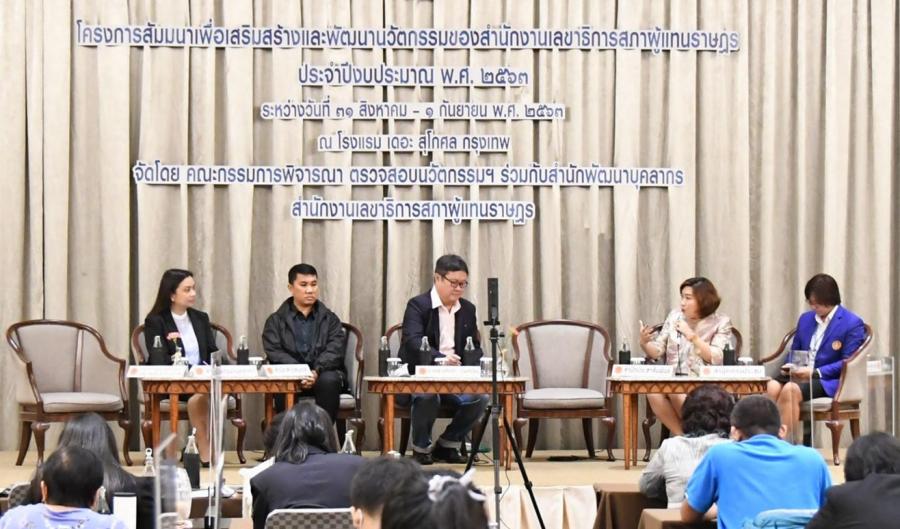| วันอังคารที่ ๑ กันยายน ๒๕๖๓ เวลา ๐๙.๐๐ - ๑๕.๓๐ นาฬิกา ณ ห้องกมลทิพย์ ชั้น ๒ โรงแรมเดอะ สุโกศล กรุงเทพฯ การสัมมนาเพื่อเสริมสร้างและพัฒนานวัตกรรมของสำนักงาน เลขาธิการสภาผู้แทนราษฎร ประจำปีงบประมาณ พ.ศ. ๒๕๖๓ ซึ่งเป็นการจัดโครงการ ต่อเนื่องเป็นวันที่สองสำหรับในวันนี้มีเสวนาหัวข้อ "การขับเคลื่อนนวัตกรรมของสำนักงาน เลขาธิการสภาผู้แทนราษฎรเพื่อก้าวสู่การเป็น SMART Parliament" โดยตัวแทนผู้ส่งข้อเสนอ นวัตกรรมของสำนักงานเลขาธิการสภาผู้แทนราษฎรประจำปี ๒๕๖๓ ประกอบด้วย กลุ่มที่ ๑ ประกอบด้วยสำนักงบประมาณของรัฐสภา สำนักภาษาต่างประเทศ สำนักวิชาการ สำนักการประชุม และตัวแทนจากคณะศึกษาดูงานกรมเจรจาการค้าระหว่างประเทศ กลุ่มที่ ๒ ประกอบด้วยสำนักพัฒนาบุคลากร สำนักสารสนเทศ สำนักประชาสัมพันธ์ และ ตัวแทนจากคณะศึกษาดูงาน บริษัท แสนสิริ จำกัด (มหาชน)