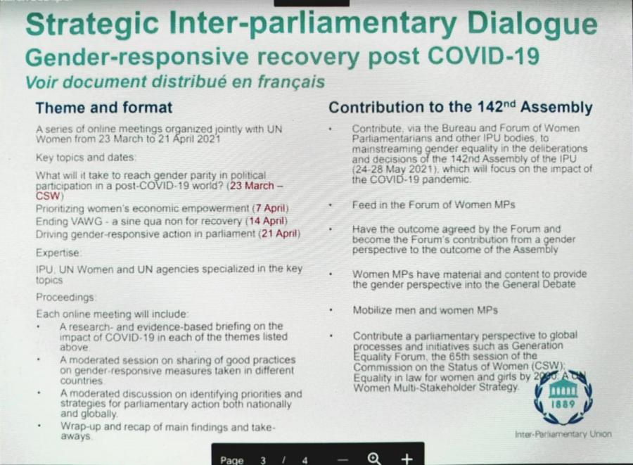 สมาชิกวุฒิสภา ในฐานะกรรมาธิการในคณะกรรมาธิการสหภาพรัฐสภาสตรี เข้าร่วมการประชุมกรรมาธิการสหภาพรัฐสภาสตรี (IPU Bureau of Women Parliamentarians) ครั้งที่ 45