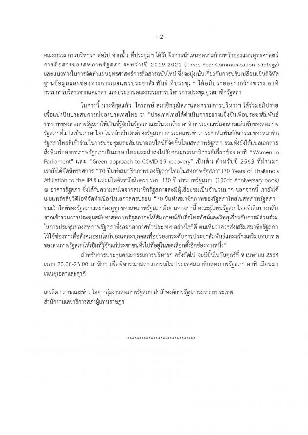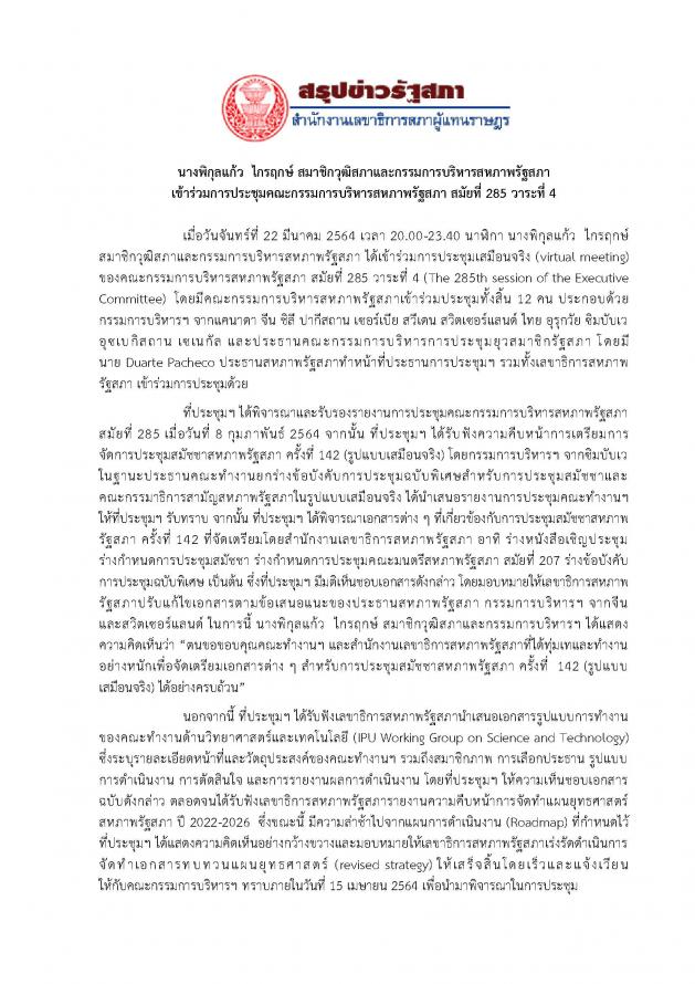 ประชุมเสมือนจริง (virtual meeting) ของคณะกรรมการบริหารสหภาพรัฐสภา สมัยที่ 285 วาระที่ 4 (The 285th session of the Executive Committee)