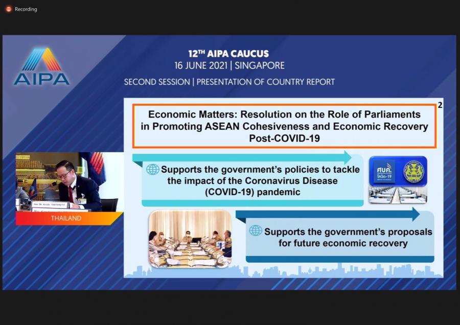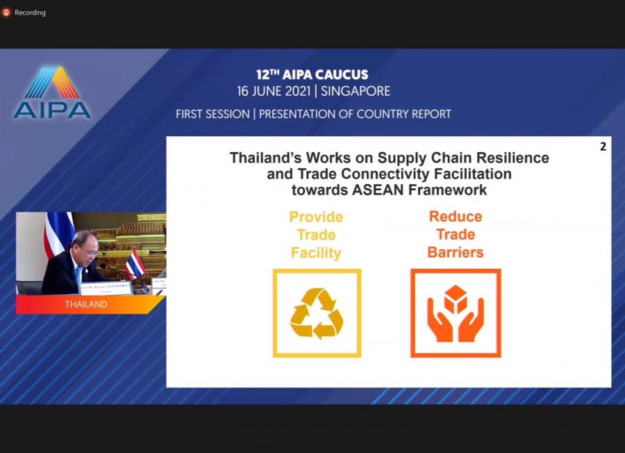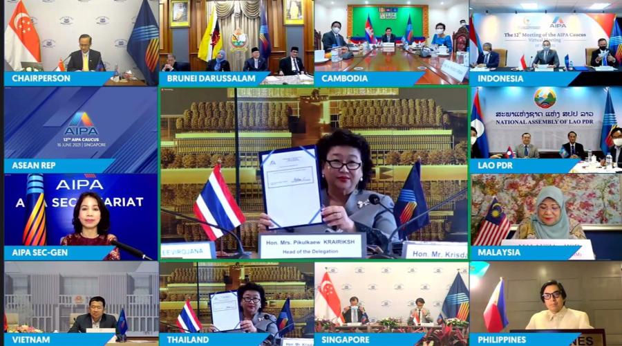 วันพุธที่ 16 มิ.ย. 64 เวลา 08.30 - 15.30 น. ณ ห้องประชุมสำนักองค์การรัฐสภาระหว่างประเทศ ชั้น 3 อาคารรัฐสภานางพิกุลแก้ว ไกรฤกษ์ สมาชิกวุฒิสภา ในฐานะหัวหน้าคณะผู้แทนรัฐสภาไทยในการประชุมผ่านสื่ออิเล็กทรอนิกส์ AIPA Caucus ครั้งที่ 12 พร้อมทั้ง นายมนูญ สิวาภิรมย์รัตน์ สมาชิกสภาผู้แทนราษฎร และนายกฤษฎา ตันเทอดทิตย์ สมาชิกสภาผู้แทนราษฎรในฐานะคณะผู้แทนรัฐสภาไทยเข้าร่วมการประชุมฯ ผ่านสื่ออิเล็กทรอนิกส์ เจ้าภาพโดยประเทศสิงคโปร์ในพิธีเปิดการประชุมฯ นายลิม เบียว ชวน รองประธานสภาสิงคโปร์ในฐานะประธานการประชุมได้แต่งตั้งนางพิกุลแก้ว ไกรฤกษ์ สมาชิกวุฒิสภา หัวหน้าคณะผู้แทนรัฐสภาไทย เป็นรองประธานการประชุมฯ ตามธรรมเนียมปฏิบัติของ AIPA
