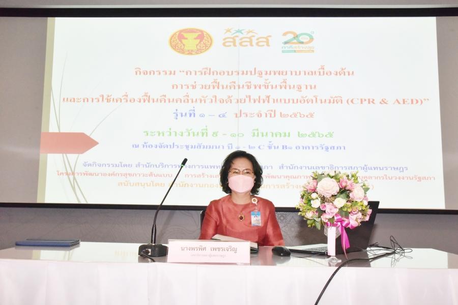 เลขาธิการสภาผู้แทนราษฎร เป็นประธานในพิธีเปิดกิจกรรม การฝึกอบรมปฐมพยาบาลเบื้องต้น การช่วยฟื้นคืนชีพขั้นพื้นฐาน และการใช้เครื่องฟื้นคืนคลื่นหัวใจด้วยไฟฟ้าแบบอัตโนมัติ (CPR & AED) ประจำปี 2565 ภายใต้โครงการพัฒนาองค์กรสุขภาวะต้นแบบฯ รุ่นที่ 1