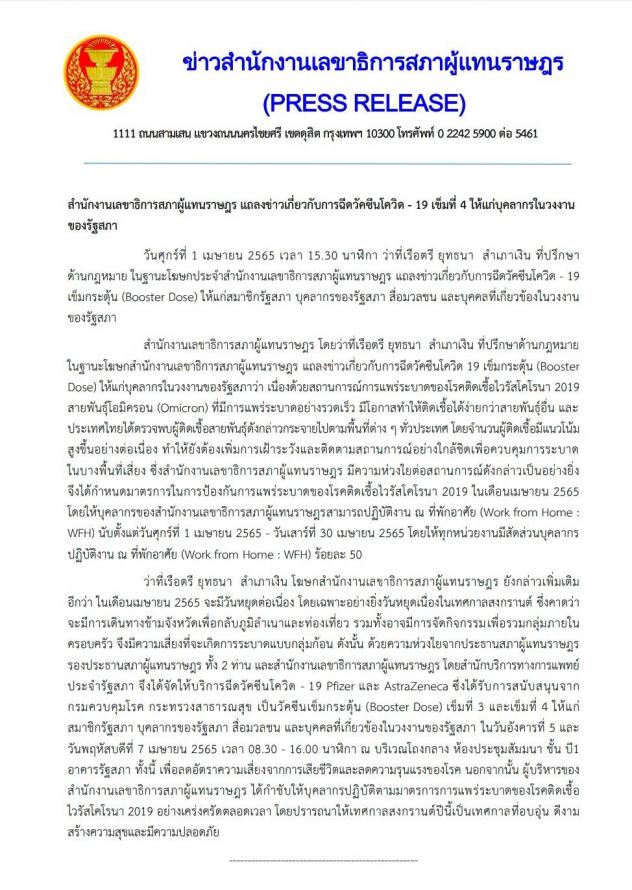 วันศุกร์ที่ 1 เมษายน 2565 เวลา 15.30 นาฬิกา ณ อาคารรัฐสภา ว่าที่เรือตรี ยุทธนา สำเภาเงิน ที่ปรึกษาด้านกฎหมาย ในฐานะโฆษกประจำสำนักงานเลขาธิการสภาผู้แทนราษฎร แถลงข่าวเกี่ยวกับการฉีดวัคซีนโควิด-19 เข็มกระตุ้น (Booster Dose) ให้แก่สมาชิกรัฐสภา บุคลากรของรัฐสภา สื่อมวลชนและบุคคลที่เกี่ยวข้องในวงงานของรัฐสภา ในวันอังคารที่ 5 เม.ย. 65 และวันพฤหัสบดีที่ 7 เม.ย. 65 เวลา 08.30 - 16.00 น. ณ บริเวณโถงกลาง ห้องประชุมสัมมนา ชั้น บี1 อาคารรัฐสภา