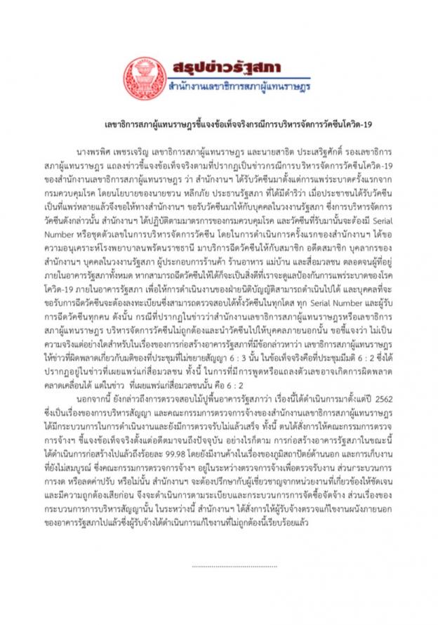 เลขาธิการสภาผู้แทนราษฎร และนายสาธิต ประเสริฐศักดิ์ รองเลขาธิการสภาผู้แทนราษฎร แถลงข่าวชี้แจง ข้อเท็จจริงตามที่ปรากฏเป็นข่าวกรณีการบริหารจัดการวัคซีนโควิด-19