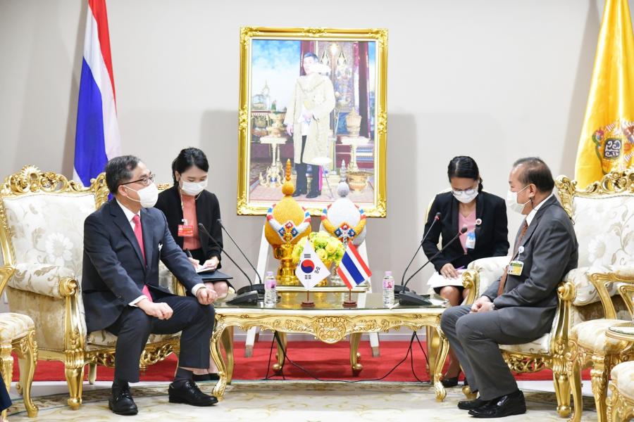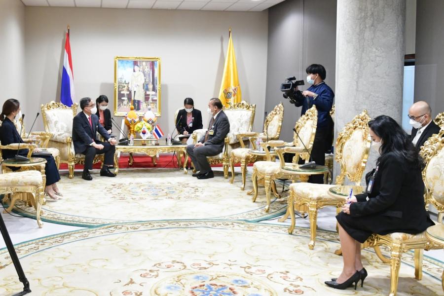 พล.ร.อ.อิทธิคมน์ ภมรสูต กล่าวแสดงความยินดีในโอกาสที่เอกอัครราชทูตฯ เข้ารับตำแหน่ง และหวังเป็นอย่างยิ่งว่าความสัมพันธ์ตลอดระยะเวลา 65 ปี จะแน่นแฟ้นมากยิ่งขึ้น ด้วยกลไกของกลุ่มมิตรภาพฯ และทางการทูต และในโอกาสที่สาธารณรัฐเกาหลีได้จัดการเลือกตั้งประธานาธิบดี เมื่อเดือน มี.ค. ที่ผ่านมา ขอแสดงความยินดีกับว่าที่ประธานาธิบดีที่ชนะการเลือกตั้ง โดยหวังว่าจะทำให้ความสัมพันธ์ระหว่างทั้งสองประเทศแน่นแฟ้นยิ่งขึ้นไป ทั้งทางด้านมิติของรัฐสภา มิติด้านการค้าการลงทุน และการแลกเปลี่ยนวัฒนธรรม ซึ่งทราบมาว่ามีการจัดตั้งกลุ่มมิตรภาพรัฐสภาเกาหลีใต้-ไทย เรียบร้อยแล้ว หากสถานการณ์การแพร่ระบาดของโรคโควิด-19 คลี่คลาย จะขอเชิญให้กลุ่มมิตรภาพฯ ทั้งสองประเทศมีการแลกเปลี่ยนการเยือนระหว่างกัน ทั้งนี้ ประเทศไทยได้เปิดเขตพัฒนาพิเศษภาคตะวันออก หรือ EEC จึงขอเชิญชวนนักลงทุนของประเทศเกาหลี ซึ่งมีศักยภาพทางการลงทุนและนวัตกรรมมาลงทุนในประเทศไทย นอกจากนี้ จุดเด่นที่สำคัญอีกประการหนึ่งของประเทศเกาหลี คือ soft power หรือการทูตสาธารณะ โดยการเผยแพร่วัฒนธรรมผ่านซีรีส์และ K-pop ทำให้ประเทศเกาหลีเป็นที่รู้จักของสังคมโลก และหวังว่าประเทศเกาหลีจะให้คำแนะนำในการผลักดันเรื่องดังกล่าวกับประเทศไทย สำหรับในเดือน ต.ค. 65 รัฐสภาไทยจะเป็นเจ้าภาพจัดการประชุมรัฐสภาภาคพื้นเอเชียและแปซิฟิก (APPF) ในการนี้ขอเชิญชวนผู้แทนจากรัฐสภาสาธารณรัฐเกาหลีมาเข้าร่วมประชุม