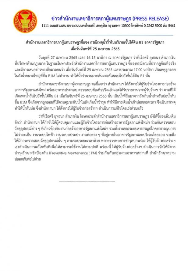 วันพุธที่ 27 เมษายน 2565 เวลา 16.15 นาฬิกา ณ อาคารรัฐสภา ว่าที่เรือตรี ยุทธนา สำเภาเงิน ที่ปรึกษาด้านกฎหมาย ในฐานะโฆษกประจำสำนักงานเลขาธิการสภาผู้แทนราษฎร ชี้แจงกรณีเหตุน้ำรั่วบริเวณชั้นใต้ดิน B1 อาคารรัฐสภา เมื่อวันจันทร์ที่ 25 เม.ย. 65 โดยสำนักงานฯ ได้สั่งการให้ผู้รับจ้างโครงการก่อสร้างอาคารรัฐสภาแห่งใหม่ พร้อมอาคารประกอบ ตรวจสอบข้อเท็จจริงแล้วและได้รับรายงานจากผู้รับจ้างฯ ว่า เป็นน้ำที่ล้นมาจากถังเก็บน้ำสำหรับบ่อน้ำล้นชั้น B1M ซึ่งเกิดจากลูกลอยที่ใช้ควบคุมระดับน้ำในถังเก็บน้ำชำรุด ทำให้มีการเติมน้ำเข้าบ่อตลอดเวลา จึงเป็นสาเหตุทำให้น้ำล้นบ่อ ซึ่งสำนักงานฯ ได้สั่งการให้ผู้รับจ้างก่อสร้างฯ ดำเนินการแก้ไขโดยเร่งด่วนแล้ว