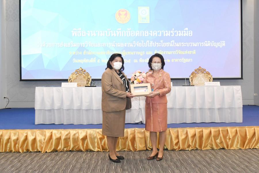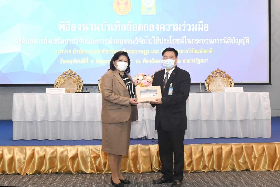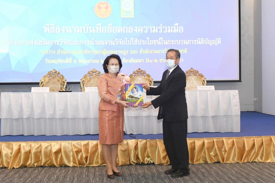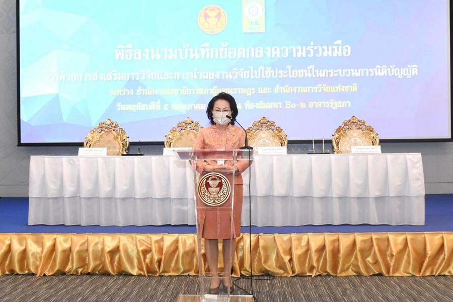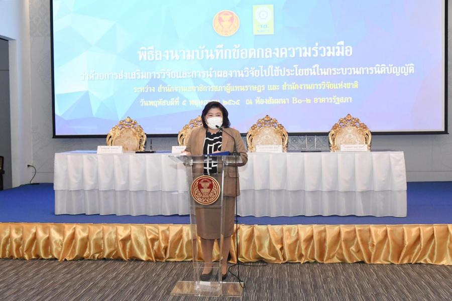 โอกาสนี้ เลขาธิการสภาผู้แทนราษฎรได้กล่าวถ้อยแถลงเรื่องความร่วมมือด้านการวิจัยว่า สำนักงานเลขาธิการสภาผู้แทนราษฎรได้ร่วมมือกับสำนักงานการวิจัยแห่งชาติ (วช.) มาอย่างต่อเนื่อง ได้แก่ การสนับสนุนทุนวิจัยภายใต้แผนบูรณาการการวิจัยและนวัตกรรมในปีงบประมาณ พ.ศ. 2562 ในประเด็นวิจัยด้านอาเซียน และการพัฒนางานวิชาการของสภาผู้แทนราษฎร ตลอดจนการสนับสนุนข้อมูลวิจัยในระบบบริหารงานวิจัยแห่งชาติของสำนักงานการวิจัยแห่งชาติ ต่อมาได้ร่วมกันขับเคลื่อนงานวิจัยผ่านการดำเนินงานของสถาบันคลังสมองของชาติในการพัฒนากลไกและกระบวนการเพื่อสนับสนุนการวิจัยและผลักดันผลงานวิจัยไปสู่การใช้ประโยชน์ในกระบวนการนิติบัญญัติ การให้ทุนสนับสนุนการวิจัยตามความต้องการของฝ่ายนิติบัญญัติในปีงบประมาณ พ.ศ. 2564 หัวข้อวิจัยเรื่อง บทบาทพนักงานอัยการในการสอบสวนคดีเพื่อการถ่วงดุลในกระบวนการยุติธรรมทางอาญา: จากปัจจุบันสู่อนาคต ขณะนี้อยู่ระหว่างการปรับปรุงแก้ไขรายงานการวิจัยฉบับสมบูรณ์ และจะนำส่งให้สำนักงานเลขาธิการสภาผู้แทนราษฎรใช้ประโยชน์ในเชิงกฎหมาย และข้อมูลเชิงนโยบายสำหรับหน่วยงานที่เกี่ยวข้อง นอกจากนั้น ยังได้ร่วมกันจัดประชุมเชิงนโยบายเรื่อง อนาคตประเทศไทยใน 10 มิติ ซึ่งเป็นประโยชน์ต่อการจัดทำแผนพัฒนาเศรษฐกิจและสังคมแห่งชาติ ฉบับที่ 13 และวงงานรัฐสภา โดยการจัดกิจกรรมร่วมกันดังกล่าวมีวัตถุประสงค์เพื่อสนับสนุนงานด้านวิชาการและการวิจัยและขับเคลื่อนให้ผลงานวิจัยถูกนำไปใช้ประโยชน์ในกระบวนการนิติบัญญัติ