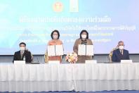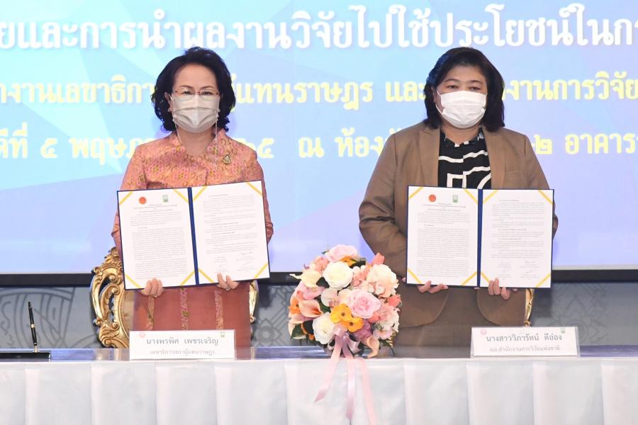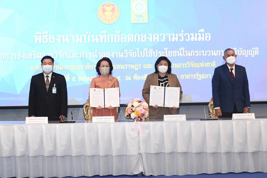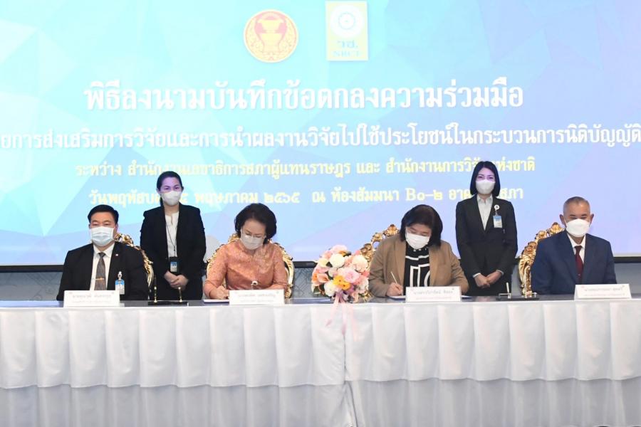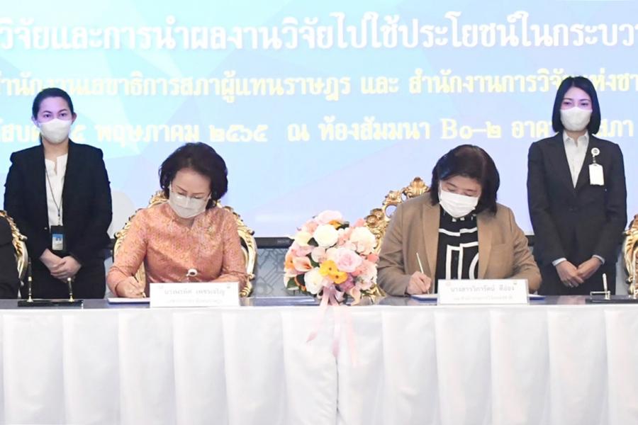 จากนั้น เป็นการลงนามบันทึกข้อตกลงฯ ระหว่าง นางพรพิศ เพชรเจริญ เลขาธิการสภาผู้แทนราษฎร กับ น.ส.วิภารัตน์ ดีอ่อง ผู้อำนวยการสำนักงานการวิจัยแห่งชาติ โดยมี นายคุณวุฒิ ตันตระกูล รองเลขาธิการสภาผู้แทนราษฎร และนายสมปรารถนา สุขทวี รองผู้อำนวยการสำนักงานวิจัยแห่งชาติ ลงนามบันทึกข้อตกลงฯ ในฐานะพยาน