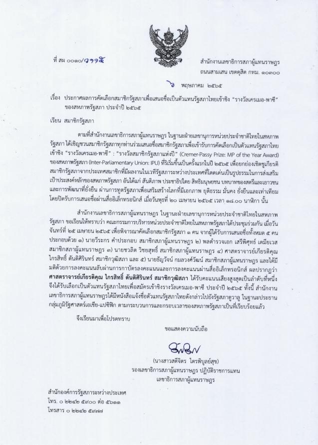 วันจันทร์ที่ 9 พฤษภาคม 2565ประกาศผลการคัดเลือกสมาชิกรัฐสภาเป็นตัวแทนรัฐสภาไทยส่งเข้าชิงรางวัล "Cremer-Passy Prize : MP of the Year Award" ของ IPU ประจำปี 2565