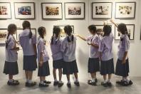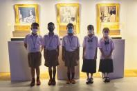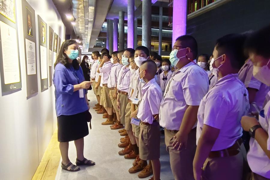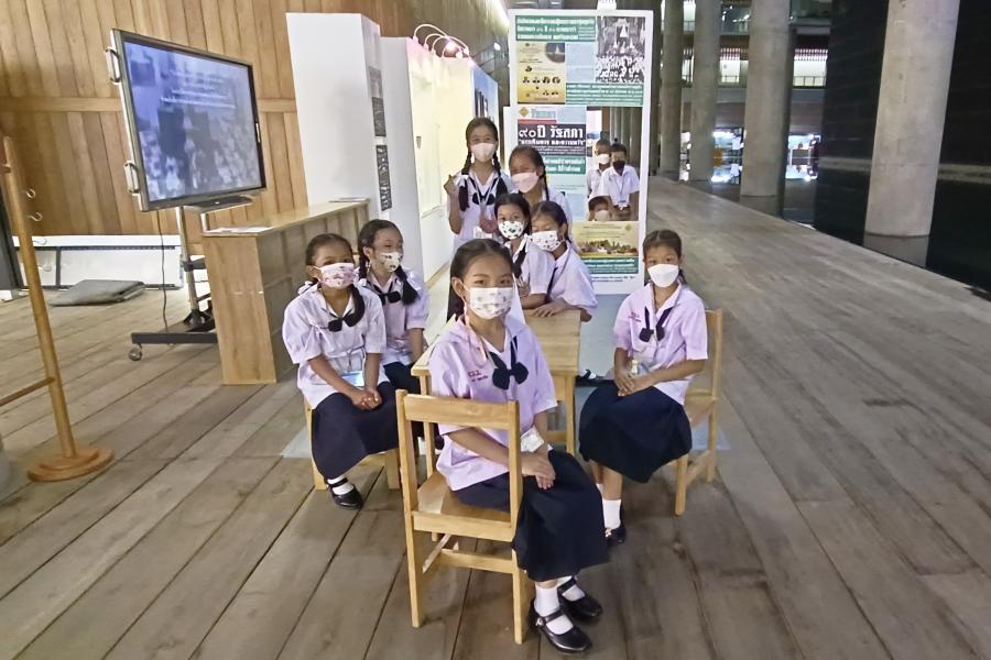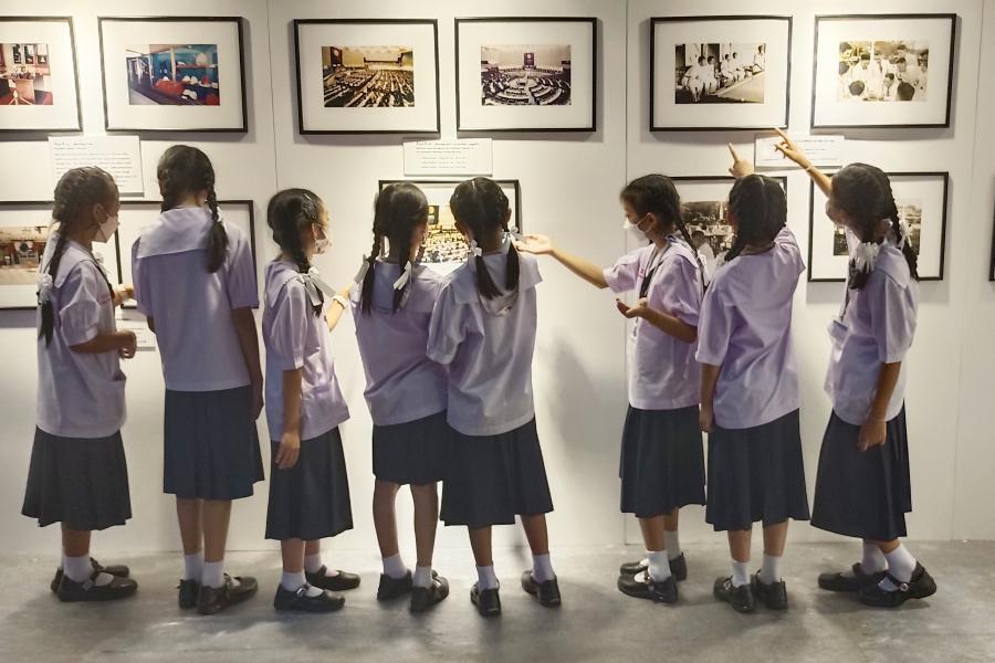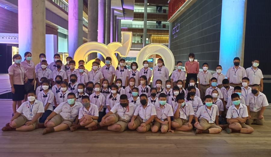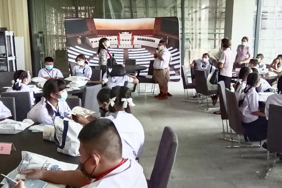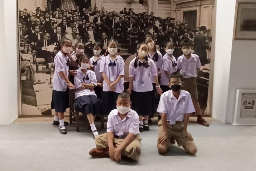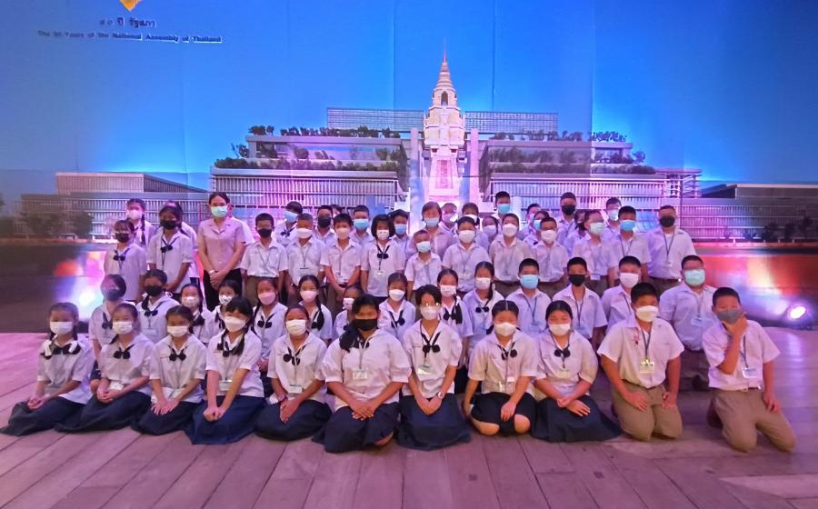 คณะครู และนักเรียนระดับชั้นประถมศึกษา โรงเรียนราชวัตรวิทยา กรุงเทพมหานคร เยี่ยมชมบริเวณภายนอกอาคารรัฐสภา เข้าชมนิทรรศการ 90 ปี รัฐสภา การเดินทางและความหวัง