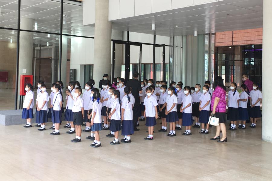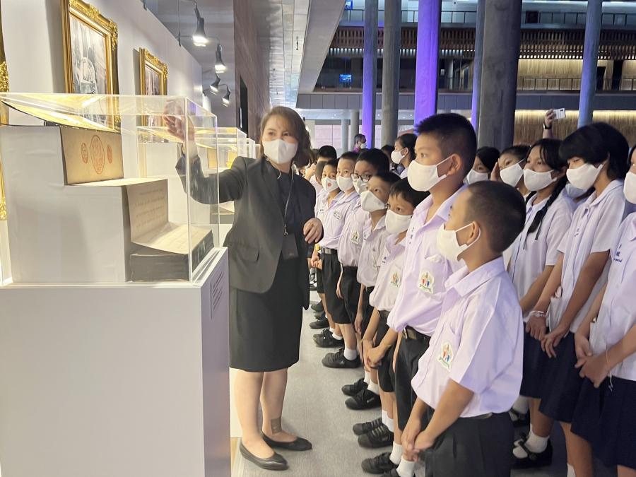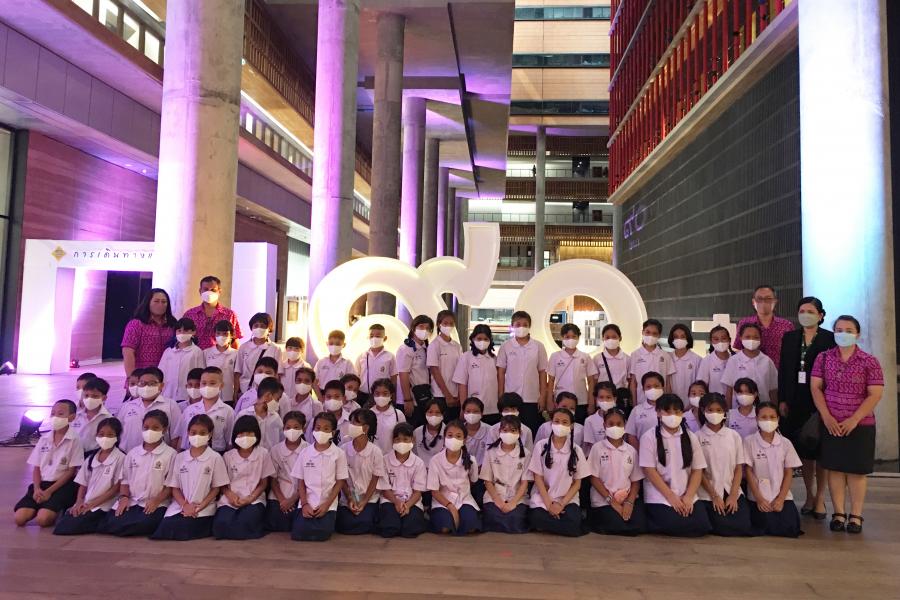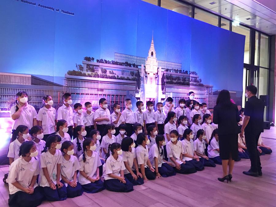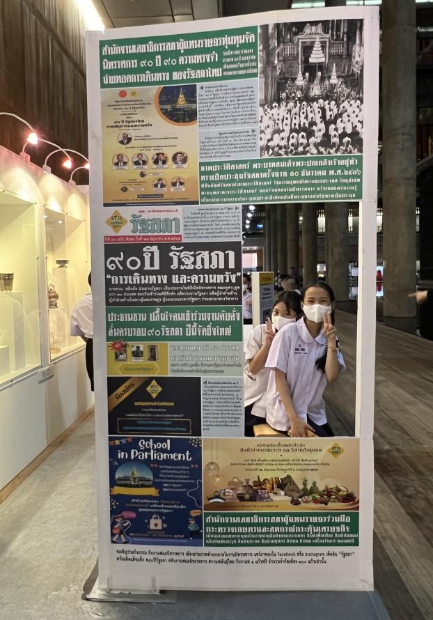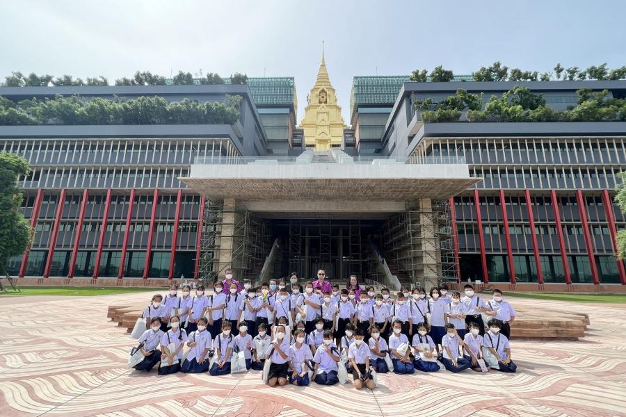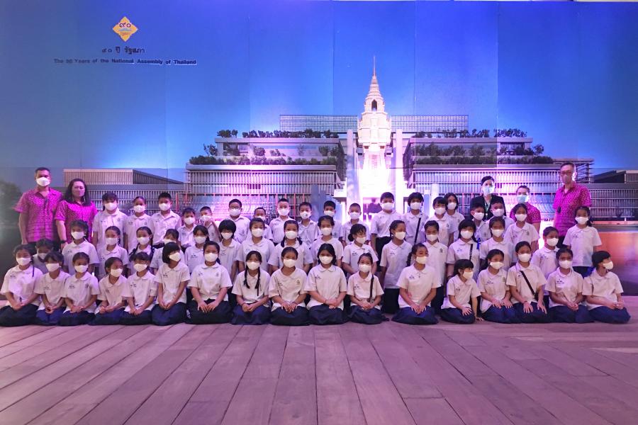 คณะอาจารย์และนักเรียน โรงเรียนวัดจันทรสโมสร กรุงเทพฯ เยี่ยมชมบริเวณภายนอกอาคารรัฐสภา และเข้าชมนิทรรศการ 90 ปี รัฐสภา การเดินทางและความหวัง