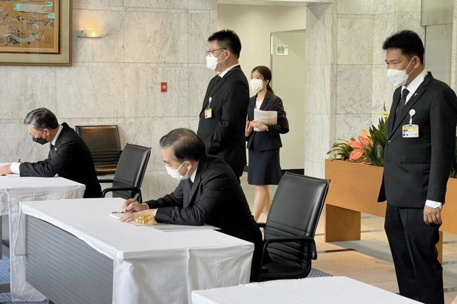 ประธานกลุ่มมิตรภาพสมาชิกรัฐสภาไทย-ญี่ปุ่น ลงนามแสดงความอาลัยต่อการอสัญกรรมของนายอาเบะ ชินโซ อดีตนายกรัฐมนตรีญี่ปุ่น ณ สถานเอกอัครราชทูตญี่ปุ่นประจำประเทศไทย
