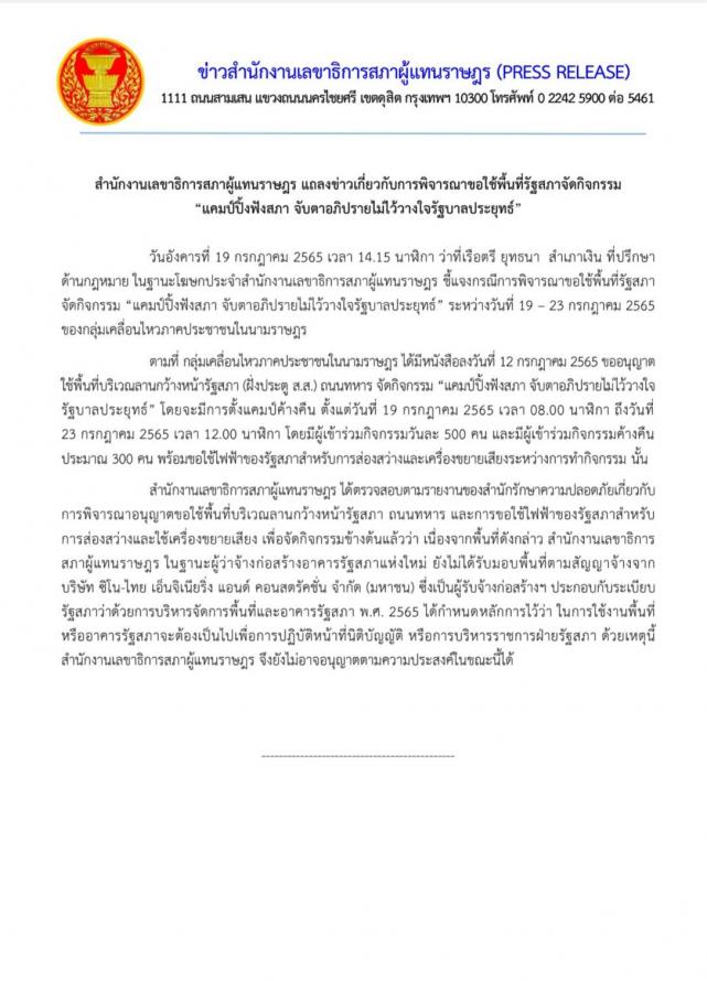 ว่าที่เรือตรี ยุทธนา สำเภาเงิน ที่ปรึกษาด้านกฎหมาย ในฐานะโฆษกประจำสำนักงานเลขาธิการสภาผู้แทนราษฎร ชี้แจงกรณีการพิจารณาขอใช้พื้นที่รัฐสภาจัดกิจกรรม แคมป์ปิ้งฟังสภา จับตาอภิปรายไม่ไว้วางใจรัฐบาลประยุทธ์ ระหว่างวันที่ 19 23 ก.ค. 65 ของกลุ่มเคลื่อนไหวภาคประชาชนในนามราษฎร