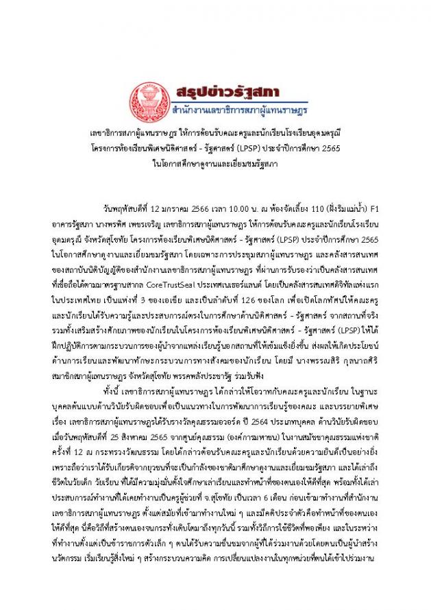 วันพฤหัสบดีที่ 12 มกราคม 2566 เวลา 10.00 นาฬิกา ณ ห้องจัดเลี้ยง 110 (ฝั่งริมแม่น้ำ) F1 อาคารรัฐสภา นางพรพิศ เพชรเจริญ เลขาธิการสภาผู้แทนราษฎร ให้การต้อนรับคณะครูและนักเรียนโรงเรียนอุดมดรุณี โครงการห้องเรียนพิเศษนิติศาสตร์ - รัฐศาสตร์ (LPSP) ประจำปีการศึกษา 2565 ในโอกาสศึกษาดูงานและเยี่ยมชมรัฐสภา โดยเฉพาะการประชุมสภาผู้แทนราษฎร และคลังสารสนเทศของสถาบันนิติบัญญัติของสำนักงานเลขาธิการสภาผู้แทนราษฎร ที่ผ่านการรับรองว่าเป็นคลังสารสนเทศที่เชื่อถือได้ตามมาตรฐานสากล CoreTrustSeal ประเทศเนเธอร์แลนด์ โดยเป็นคลังสารสนเทศดิจิทัลแห่งแรกในประเทศไทย เป็นแห่งที่ 3 ของเอเชีย และเป็นลำดับที่ 126 ของโลก เพื่อเปิดโลกทัศน์ให้คณะครูและนักเรียนได้รับความรู้และประสบการณ์ตรงในการศึกษาด้านนิติศาสตร์ - รัฐศาสตร์ จากสถานที่จริง รวมทั้งเสริมสร้างศักยภาพของนักเรียนในโครงการห้องเรียนพิเศษนิติศาสตร์ - รัฐศาสตร์ (LPSP) ให้ได้ฝึกปฏิบัติการตามกระบวนการของผู้นำจากแหล่งเรียนรู้นอกสถานที่ให้เข้มแข็งยิ่งขึ้น ส่งผลให้เกิดประโยชน์ด้านการเรียนและพัฒนาทักษะกระบวนการทางสังคมของนักเรียน โดยมี นางพรรณสิริ กุลนาถศิริ ส.ส.จังหวัดสุโขทัย พรรคพลังประชารัฐ ร่วมรับฟัง